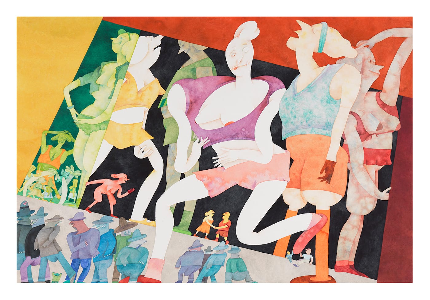 It is Nilsson’s attention to awkward and unconscious things that people do to themselves while out in public that makes her work fascinating to look at. Why has that figure in “Red Wall” (1987) reached under her armpit? Is it to scratch her back? She’s looking at her four fingers poking out from behind her arm, as if they belong to someone else. Maybe they do. What about the woman in “Vested Interest” (1987), who, while walking, has reached down behind her left leg to scratch the inside of her thigh? Is she doing this because she thinks no one will notice? Each of the other large figures in “Vested Interest” seem to be going through a similar moment of adjustment and momentary shame. Their expressions are distinct, comic, and revealing. Meanwhile, what about the smaller figures in the work? What are they up to? What are all those little men in hats thinking about?
