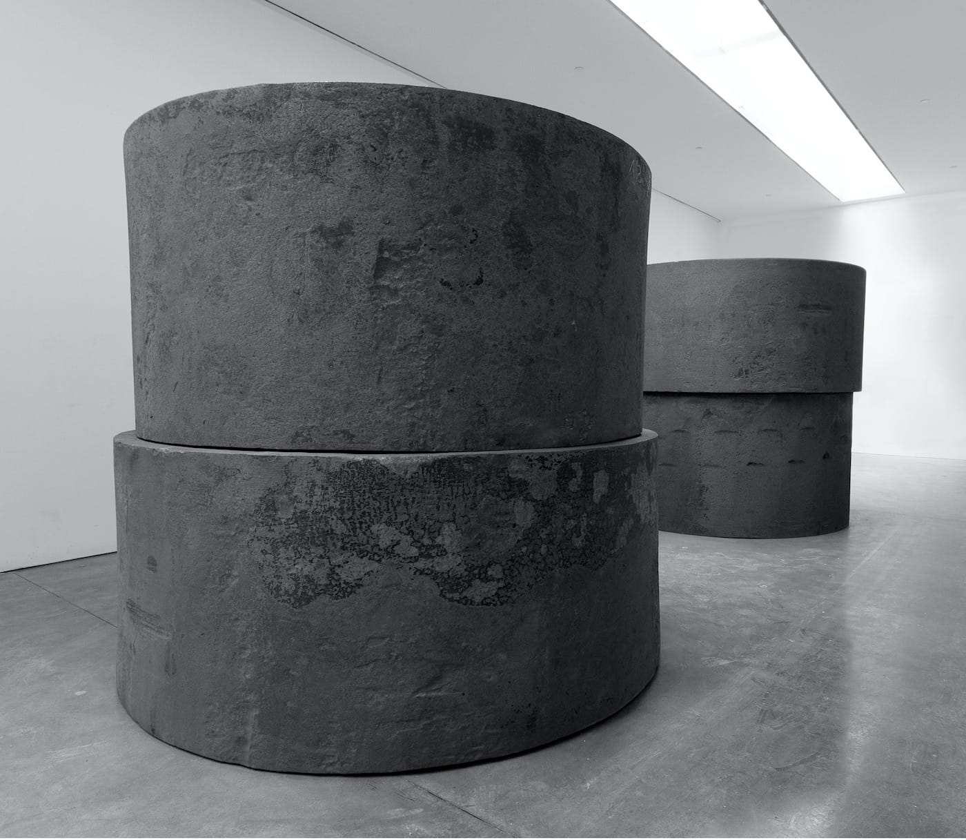 And in the gallery on West 24th Street, there are four of his Forged Rounds series (2019). In one room, a group of them, each 50 tons in weight, are placed so close together that they almost touch. In another room, however, they are set far enough apart that you can walk between them. The rounds, which have flat tops, are of varied widths and heights; some are shorter than most adults, while others are taller than almost anyone.