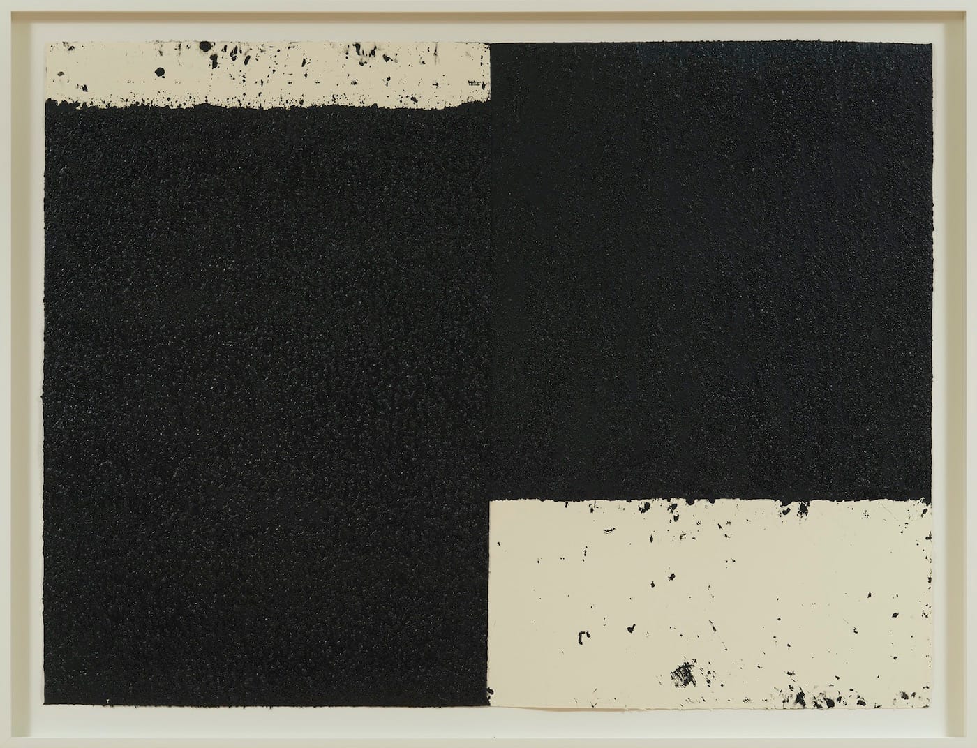 Richard Serra, “Diptych #6” (2019), paintstick, etching ink, and silica on two sheets of handmade paper; 47 1/2 x 63 1/4 inches; 120.7 x 160.7 cm, © 2019 Richard Serra/Artists Rights Society (ARS), New York; photo: Robert McKeever (courtesy Gagosian)