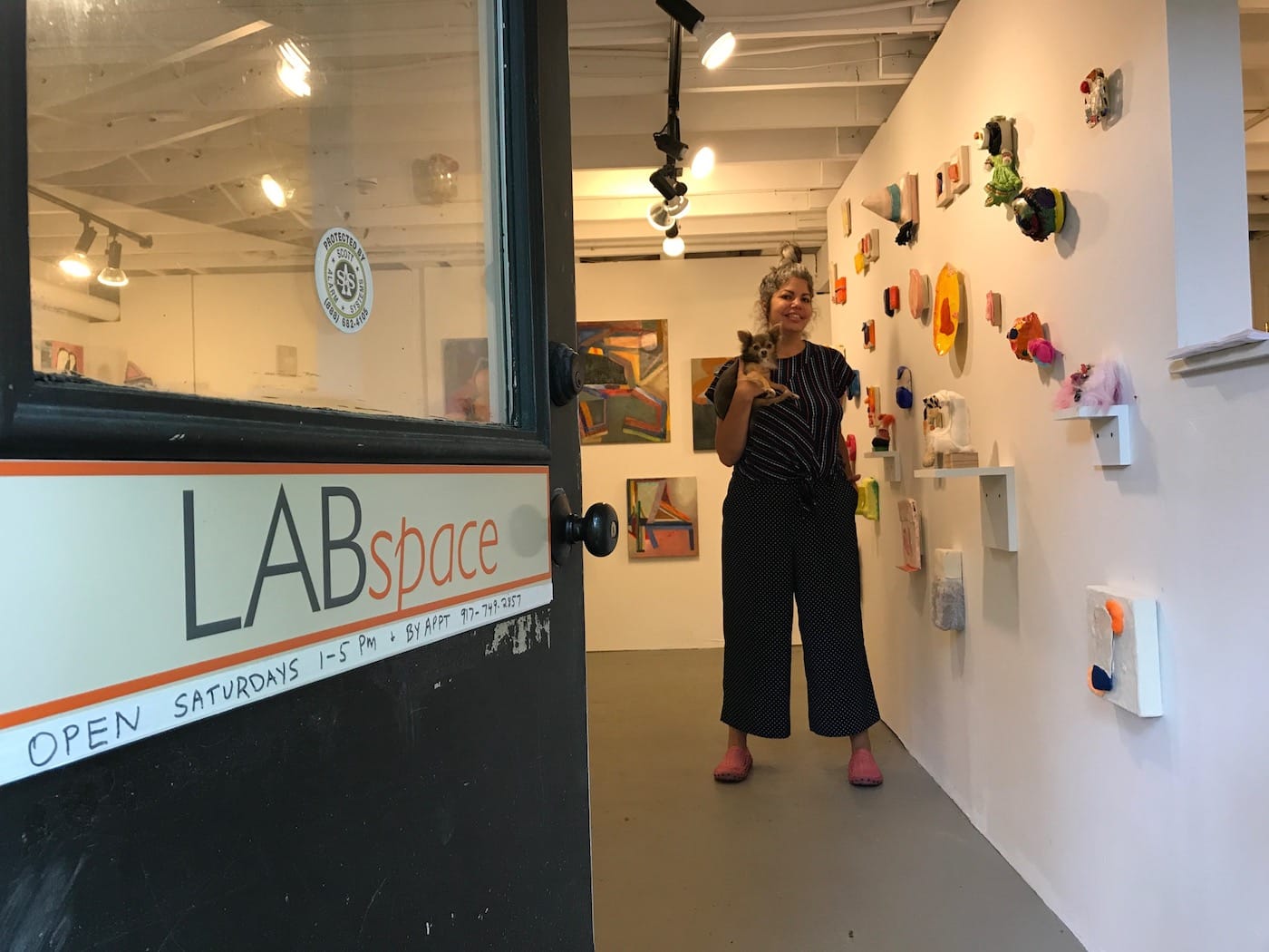 The current show, Spatial Oddities, transforms the diminutive cave-like gallery into an outburst of whimsical, color-saturated objects and paintings, reveling in tactility and oddball materials. Despite the fact that the seven participating artists (Becca Van K, Carol McMahon, Christina Tenaglia, Claire Sherwood, Claudia Tienan, Diane Dwyer, Maddi LaVallee, and Susan Carr) collaboratively installed their work in LABspace’s intimate interior, a surprising order and rigor prevail.