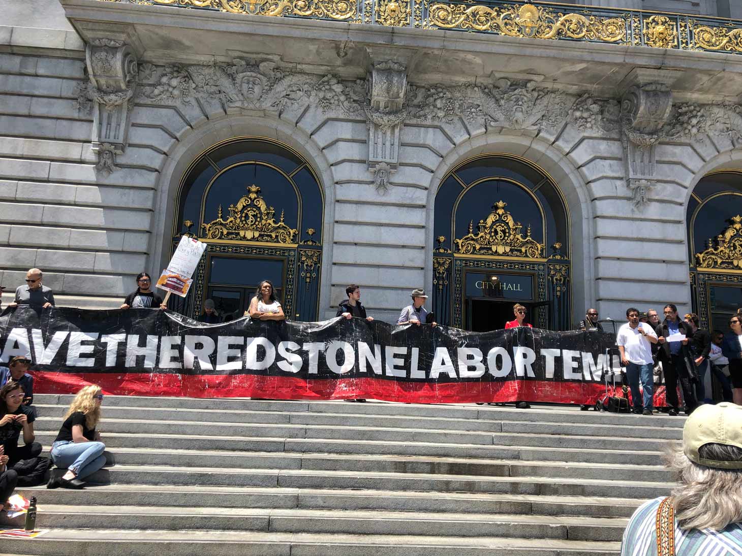 Last Thursday, June 20, a group of 100 San Franciscan activists and artists rallied outside City Hall demanding to “Save the Redstone Labor Temple.” The Lab told Hyperallergic in an email that Amy Beinart,
