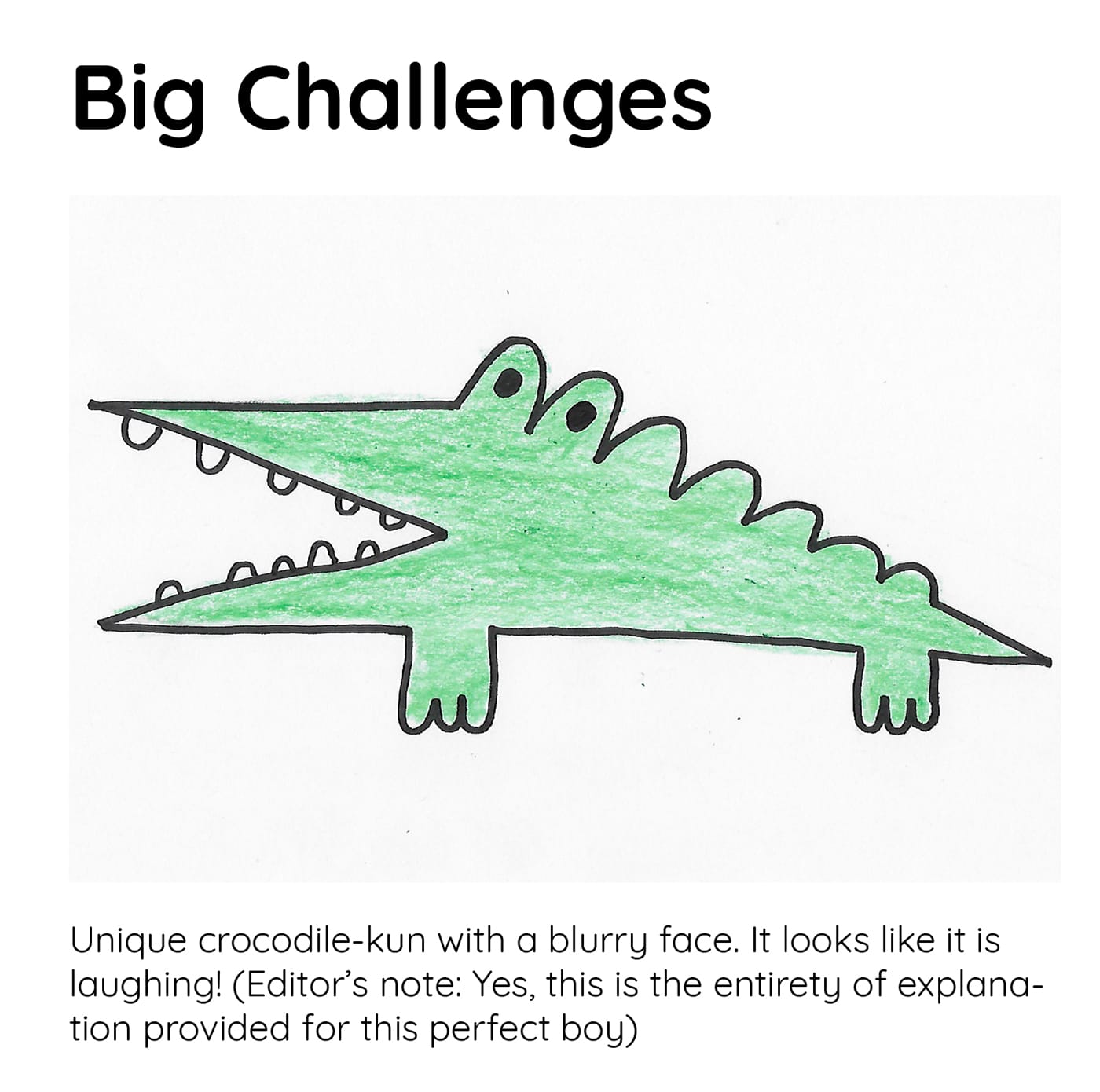 I was alerted to the existence of Big Challenges by a Twitter thread by @chloi, which also clued me into Have You Heard About This Boy?, a hand-drawn fanzine by an artist named R25th, which captures and chronicles some of these lesser-run but amazing Sanrio characters. According to Have You Heard About This Boy, Big Challenges was introduced in 1978 as a “[u]nique crocodile-kun with a blurry face. It looks like it is laughing!”
