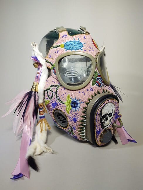 The dialog between traditional technique and contemporary narrative can be seen most clearly in Maybee’s gas mask series, which won the Santa Fe Indian Market 2018 Best of Classification award in Beadwork/Quillwork.