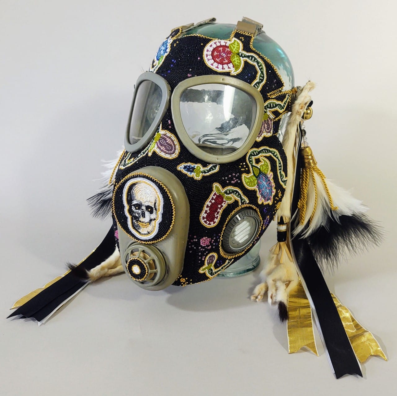 From there, the concept evolved to include stylized smallpox and bubonic plague bacteria designs intertwined with floral designs bound by DNA strands, all rendered in intricate and vividly colored beadwork on Czech gas masks. “At the end of the day,” he said of this design, “we’re all human beings. We’re all suffering from this pandemic.”
