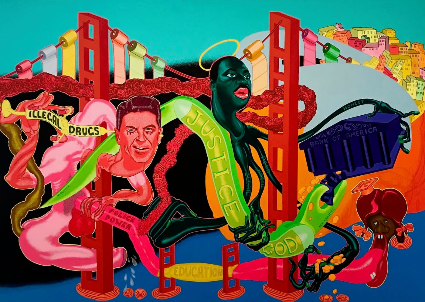 The primary sin of this exhibition is its inability to present a clear, operational definition of the word “conspiracy.” Although the show claims to explore the simultaneous development of two kinds of conspiratorial art — one that “hews closely to public record” and another that dives into the “fever dreams of the disaffected” — the nuance within these two categories is lost by a freewheeling organization that sees AIDS activism agitprop and Black Panthers’ ephemera as equal to the swirling scatological appendages of Peter Saul‘s “Government of California” (1969).