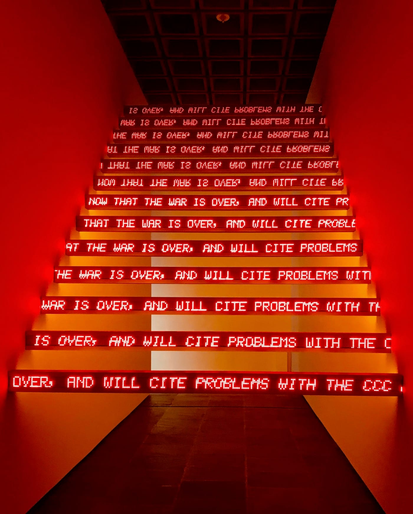 The exhibition pays deference to these fact-finding revelations with works by artists who work from public records, such as Hans Haacke, Jenny Holzer, and Mark Lombardi. Despite their relationship to more speculative works of fiction on display, these artists make an impact in the exhibition because they are rooted in reality. Their works are not sensationalist conspiracies capitalizing on public anxieties; rather, they piece together a puzzle of facts. Haacke presents his 1971 exposé on New York City’s heinous cadre of slumlords. Holzer reproduces 9/11-related declassified government documents as art objects. Lombardi turns a conspiratorial web chart into a fact-based detailing of government corruption following a detailed trail of money to the laundering of money and weapons. This is art serving the public interest, relaying poor governance as a brilliant example of Hannah Arendt’s banality of evil, which describes the way bureaucratic systems can normalize wrongdoing on unimaginable political, financial, and criminal scales. Sometimes, conspiracy is no big secret — it’s just bad government. Understanding that reality helps us hold our leaders accountable.