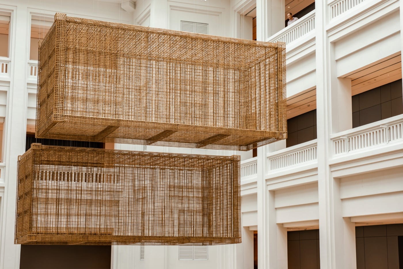 SINGAPORE — Of the three works visitors are most likely to bump into first after entering the 60,000-square-meter space of the National Gallery Singapore to view its latest — as well as Southeast Asia’s first — show on Minimalism, Minimalism: Space. Light. Object., none of them feel explicitly Minimalist. Sopheap Pich’s “Cargo” (2018), which comprises two, six-meter-long shipping containers made out of bamboo, rattan, and metal commissioned by the gallery, suspended by wires several meters in the air, looms over the heads of guests and gives the sense of an alien light fixture before it registers as a work of art. Turner Prize winner Martin Creed’s “Work No. 1343” (2012), lying in close proximity to his “Work No. 840” (2007), itself masquerading as wall decoration, is recreated in the gallery’s cafeteria, and comes across as an eclectic, effervescent choice of interior design.