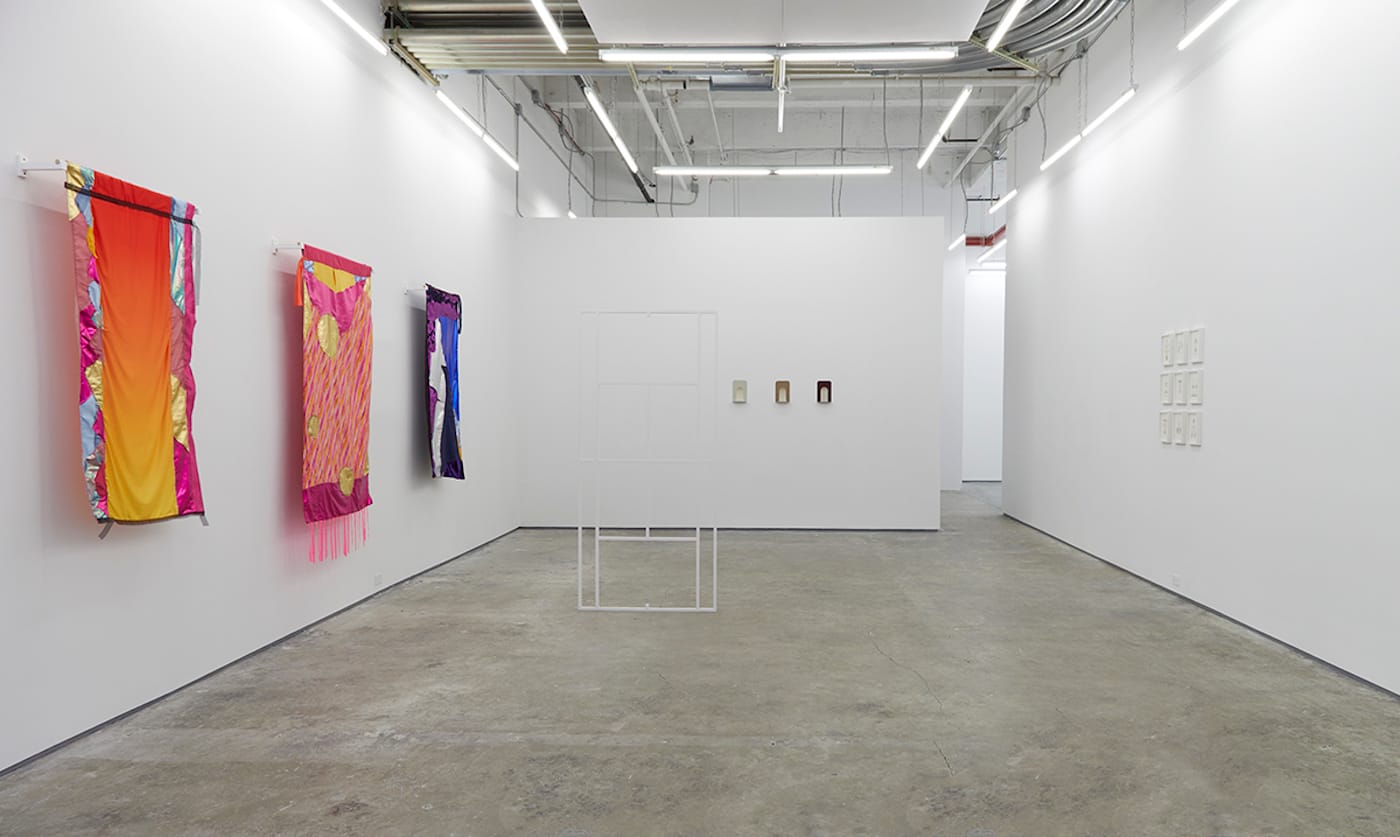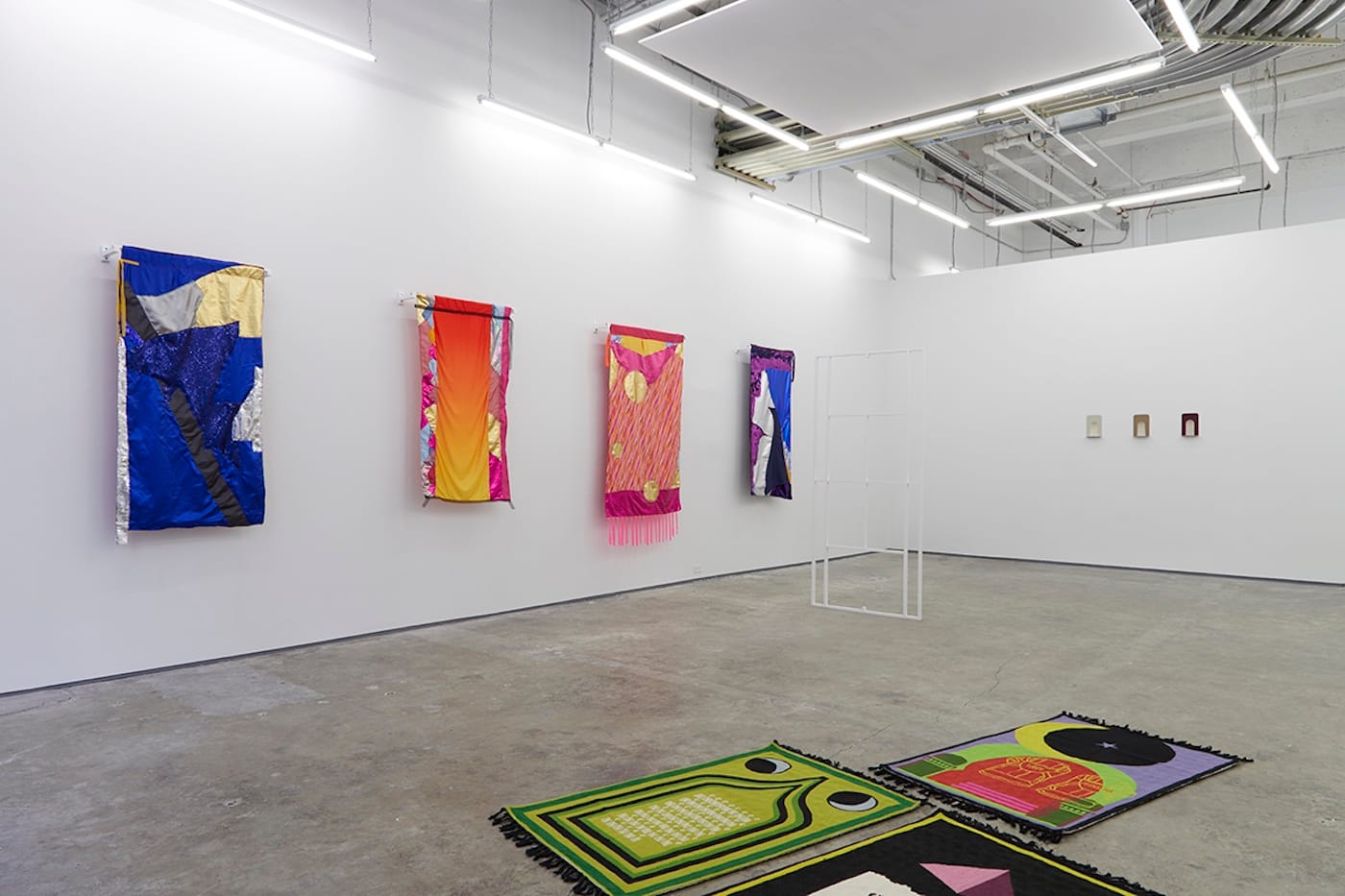 Cauleen Smith shows pieces of fabric that she sewed together and attached to a metal rack extending from the wall. It took a minute to realize that each of three pieces allude to a time of day, which she indicates in her titles (“Territory of the Sunset,” “Territory of the Dawn,” and “Territory of Midnight,” all 2017), but those times are evoked as place and possibly an otherworldly experience.