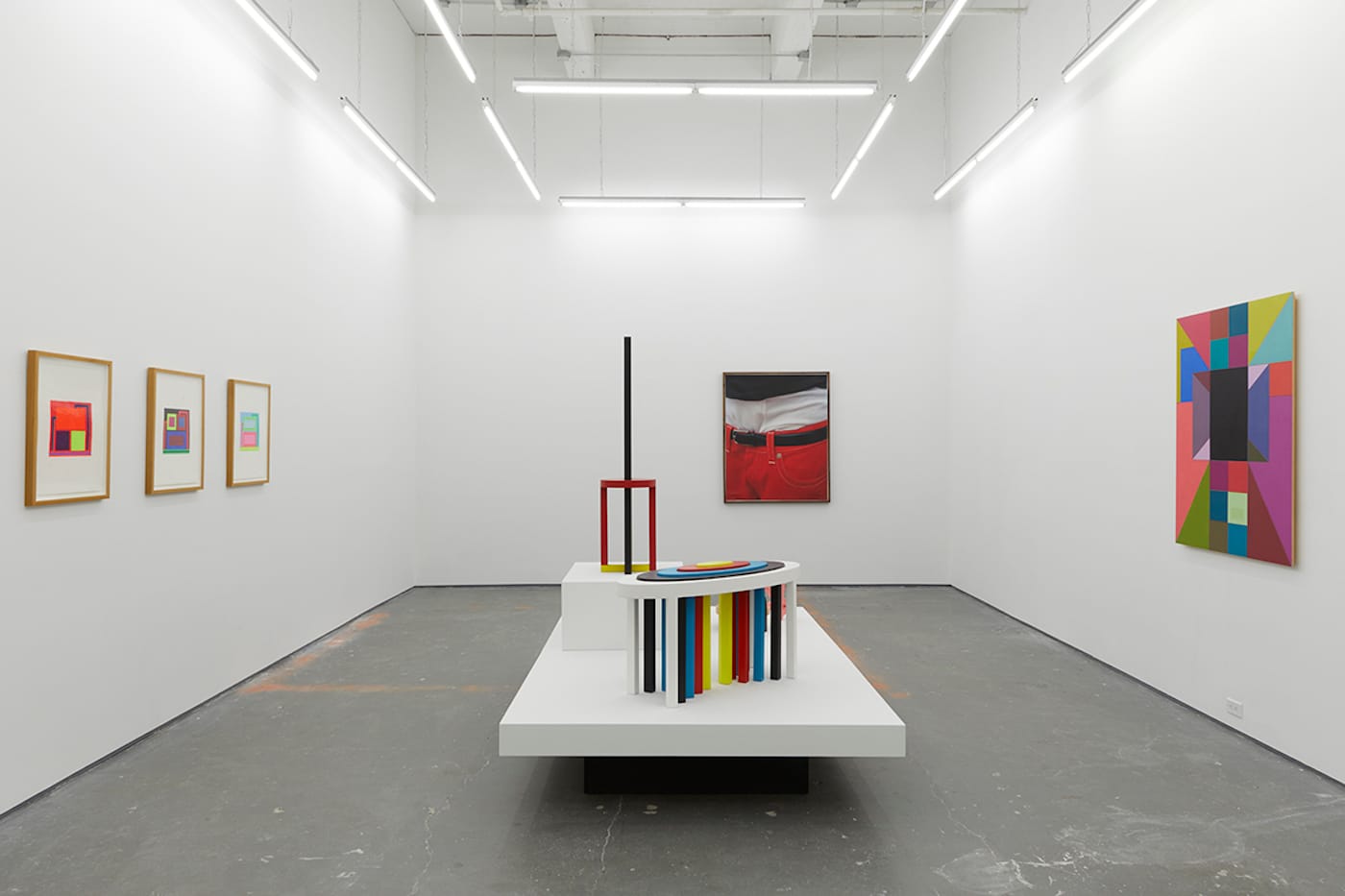 Admittedly, this is an unfair analogy, but it was what popped into my mind when I went to see the group show ROYGBIV at the Kate Werble Gallery (January 6 – February 10, 2018), which brought together the work of 10 artists exploring diverse mediums, including handmade silk rugs; HD video; textiles; bookends, Hydrocal, and epoxy; wood and paint; ink, pro-marker, and graphite on paper; painted wood; Day-Glo acrylic; and oil paint.