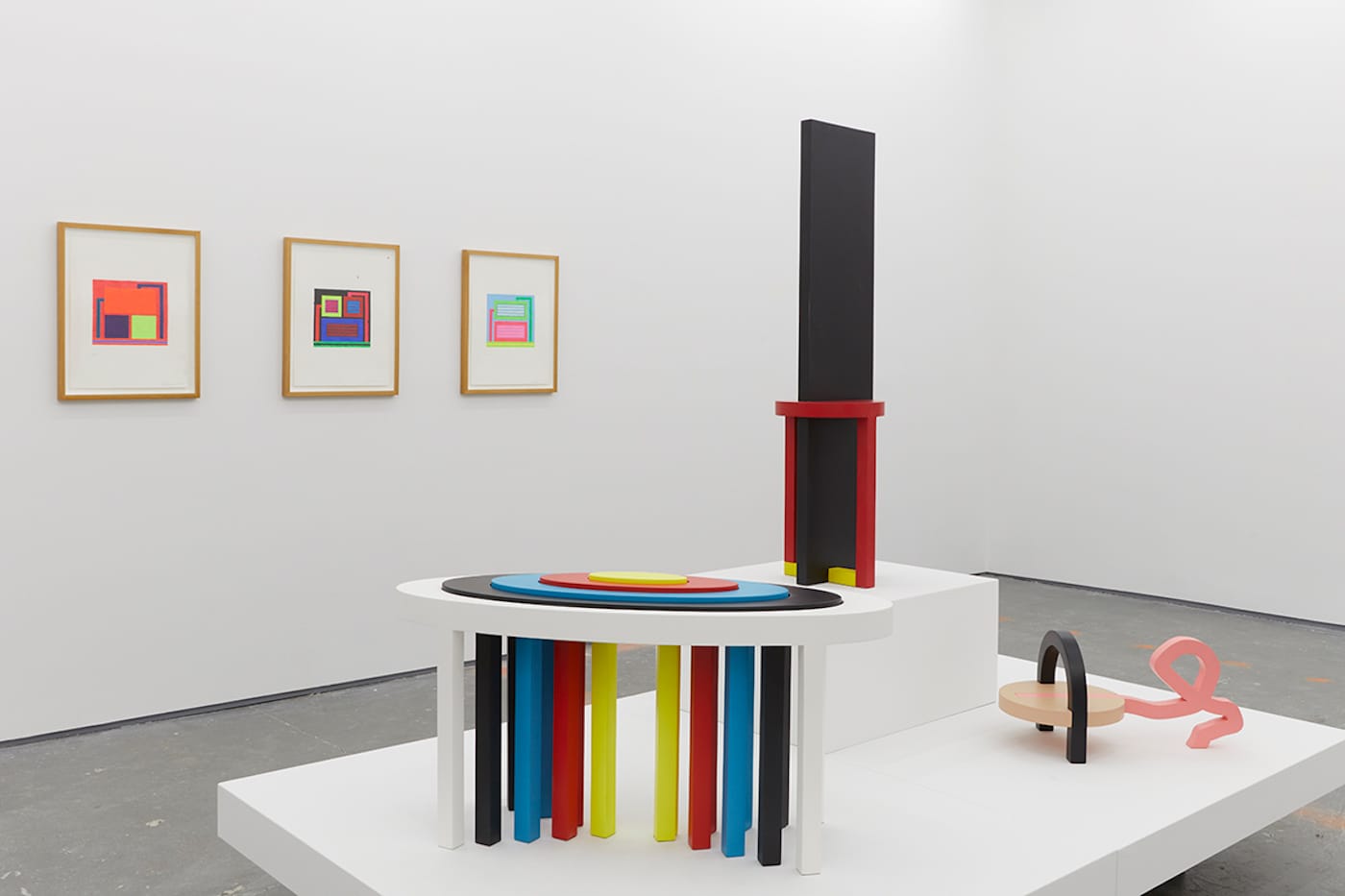 Made of wood and painted white, Elizabeth Atterbury’s pristine “Court” (2017) stands in the middle of the floor, a large rectangle sectioned into discrete rectangles by vertical and horizontal bars. “Court” seems to allude to an architectural blueprint or façade that Atterbury has stripped down to its essential diagram. In her contextualization of geometry with reference to architecture, Atterbury shares something with Peter Halley, who has three “cell” works done in acrylic and Day-Glo colors on paper.