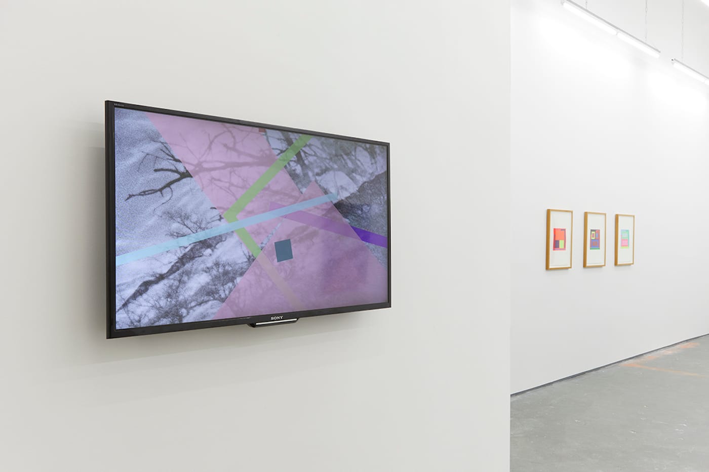 Julio César Morales showed a video, “We Are the Dead” (2013, with collaborative text by Miguel Calderon, programming by David Goldberg, and music by Shimomitsu), that ran a little over 14 minutes. A black-and-white image of a desert-like landscape filled with trees, their bare branches, is overlaid with pink and green geometric shapes that unexpectedly change in size as they move across the screen. Over a rhythmic, droning soundtrack, sections of a poem laced with violent imagery periodically interrupt the film, suggesting that what is being looked is a site of unseen violence and heartbreak. By bringing together four different languages (music, poetry, geometry, and cinema), Morales invites us to immerse ourselves into something that is at once soothing and jarring.