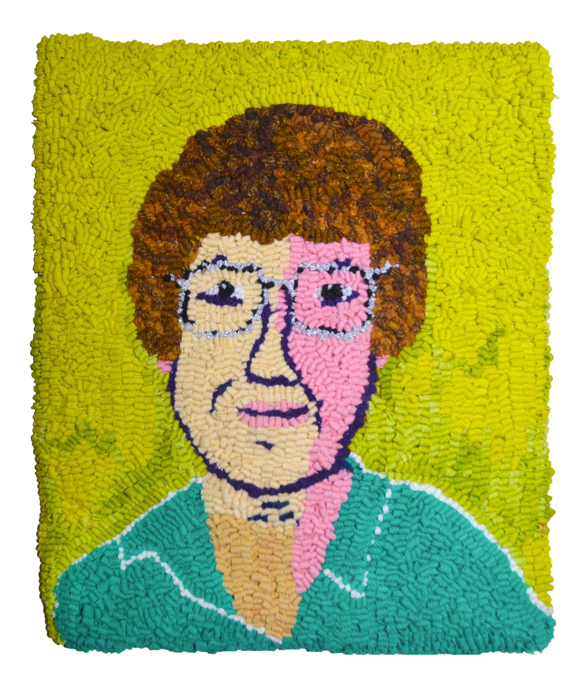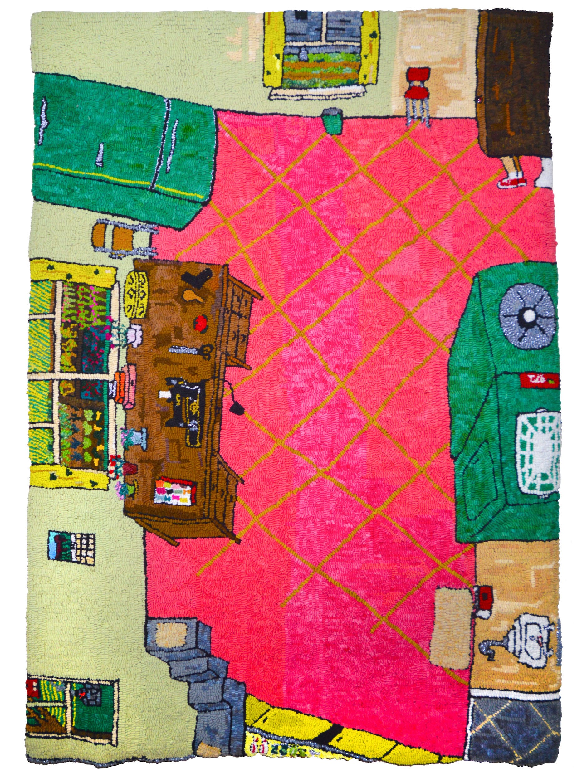 In her mid-60s and mostly self-taught, Tooley Parker got her BFA in dance from New York University and studied music for many years. According to Keane, she did not begin making hooked rugs until years later, after moving out of New York City. From Tooley Parker’s website, I learned that she makes the foundation for the rug, spins the yarn, and hand-dyes it, which explains the wide range of unlikely colors, from magenta and pink to multiple greens.