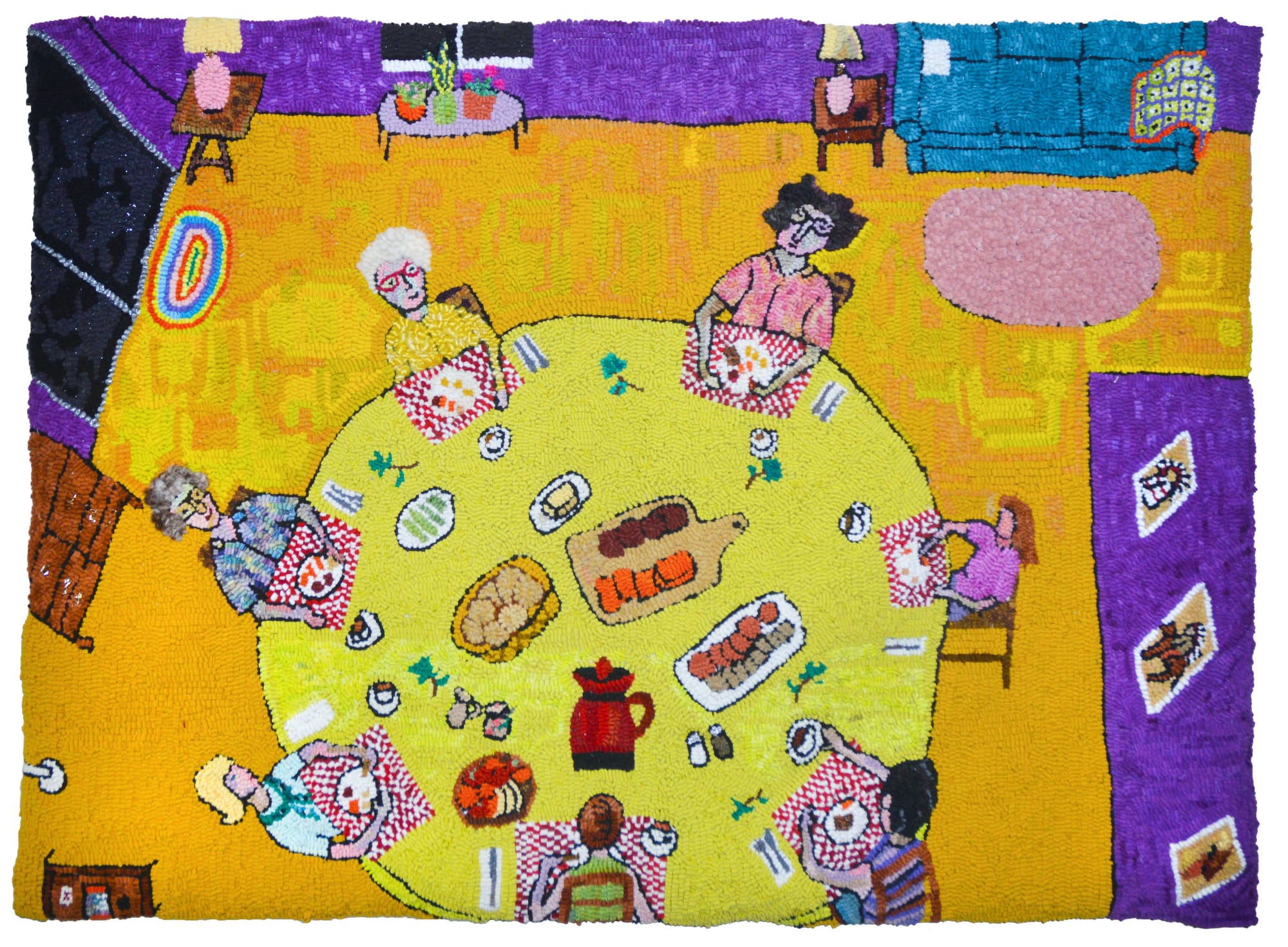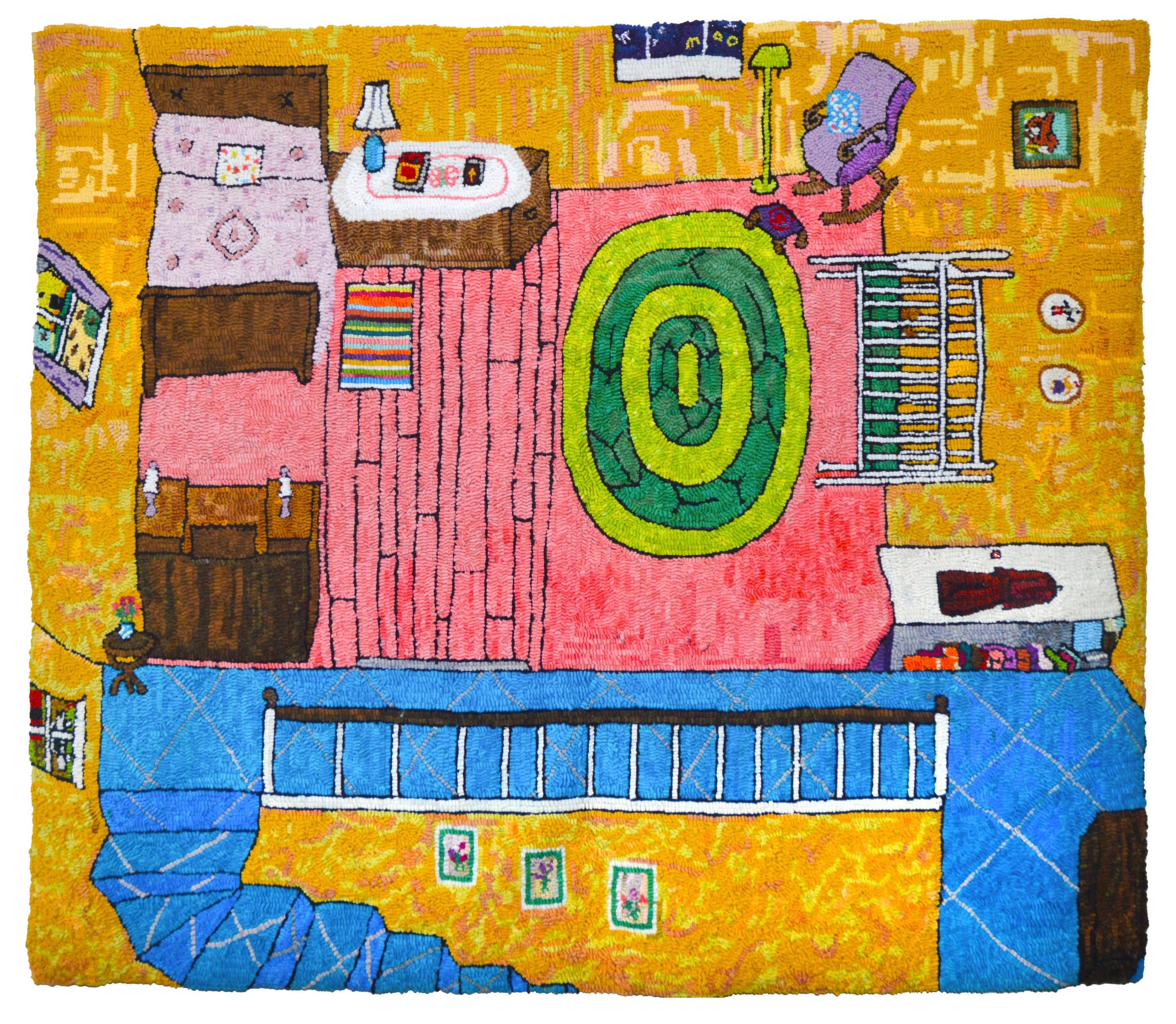 In “Upstairs Bedroom, Ruth’s” (2023), the bird’s-eye view offers multiple perspectives, which the artist fits together on the rug’s two-dimensional plane. It appears as if the walls have fallen outward, however the objects in the room are presented from different viewpoints. A bed with a high headboard is jammed in the upper left corner, while a rocking chair in the opposite corner is perched on the edge of a pink rug, ready to tumble into space. The left wall angles upward, and the cropped windows conform to that reading, yet the wall on the right is flat. A crib seems to be lying on its side, but two oval portraits above it and a doorway to the right suggest it is upright against a wall. A small striped rug by the bed and the green concentric bands of an oval rug by the crib add to the overall sense of patterning.