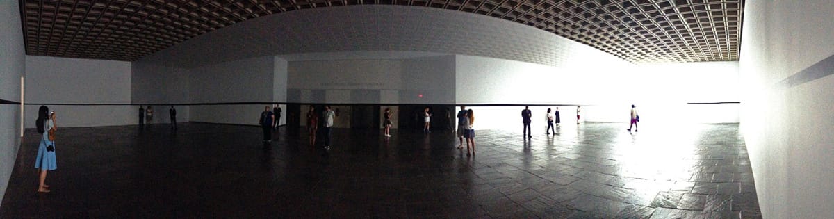 The stillness of the gallery inspires a certain dilation of experience, time appears to move slower as your thoughts begin to unwind in the hermetic space. There is a specter of acuity to the work that sharpens the senses if you allow yourself to settle into a contemplative pace. As your perceptions increase, the space begins to open. Lit by a single trapezoidal window, light stretches through the work in an even flow, walking along the central scrim, you can feel the light shifting with your body. It is in this activation of natural light that I felt closest to the work, the warmth of a late summer day juxtaposed with the the severity of the institutional gallery placed me somewhere between joy and excited anxiety. As I spent time in the gallery my understanding of the space evolved along with my sensibilities, I watched as a blade of light slowly moved along the axes of the window, I noticed the compression of vertical and horizontal space, and I noticed the people around me as well. Perhaps the greatest quality of Irwin’s work is its ability to awaken deep sympathies in the viewer, as I watched the people around me I noticed a consistent feeling of peaceful contemplation amongst the museum goers, there were no crying babies, no flustered tourists, and, dare I say it, no jaded New Yorkers. Instead I saw lots of smiles and felt an even calmness.
