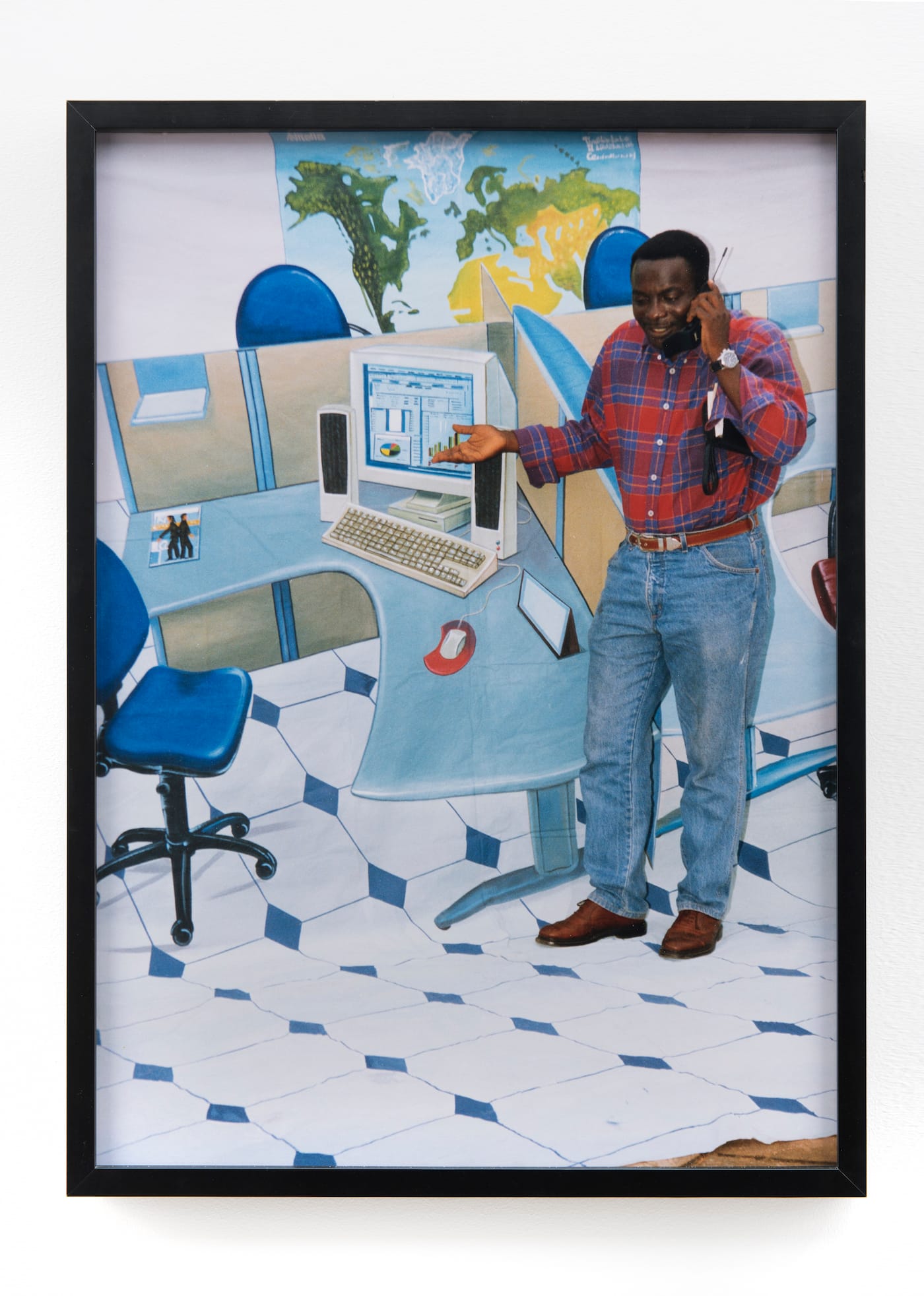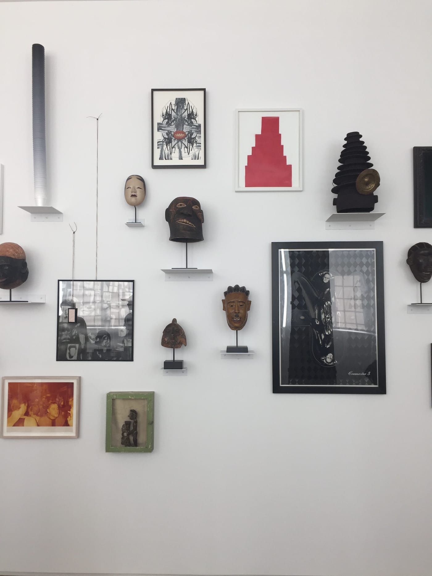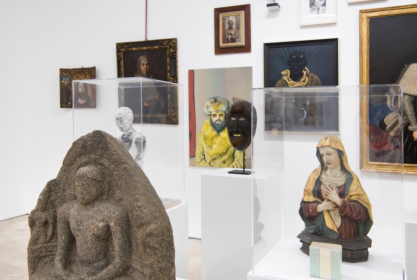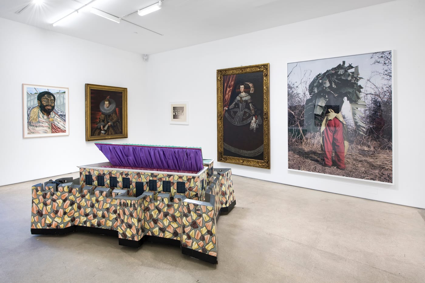 Instead, these memorial slave castles are presented alongside works ranging from 16th-century European paintings of patrons and saints to Lynette Yiadom-Boakye’s moody fictional portraits. West African bateba shamanic shrine figurines sit kitty-corner to Beverly Fishman’s subtly neon-backlit geometric wall-mounted sculptures, which are meant to evoke the experience of a drug trip. Devotional Hindu serpent drawings are juxtaposed with Philip Kwame Apagya’s portrait photography shot against drawn backgrounds of contemporary technological apparatuses like office desks laden with phones and computers.