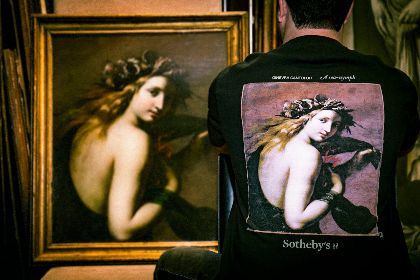 Among the masterworks you could now wear proudly everywhere you go is “A Sea-Nymph” by the Italian baroque artist Ginevra Cantofoli’s, whose specialty was painting female figures. Known as one of her masterpieces, the work probably depicts Galatea, one of the 50 Nereides in Greek mythology, memorable for turning her mortal lover Acis into a river after he was killed by a cyclops in Ovid’s Metamorphoses. In Cantofoli’s rendering, she dons an impressive crown of mollusk shells and holds a coral close to her body, accessories which are arguably less practical than Sotheby’s and Highsnobiety’s highly wearable t-shirt.