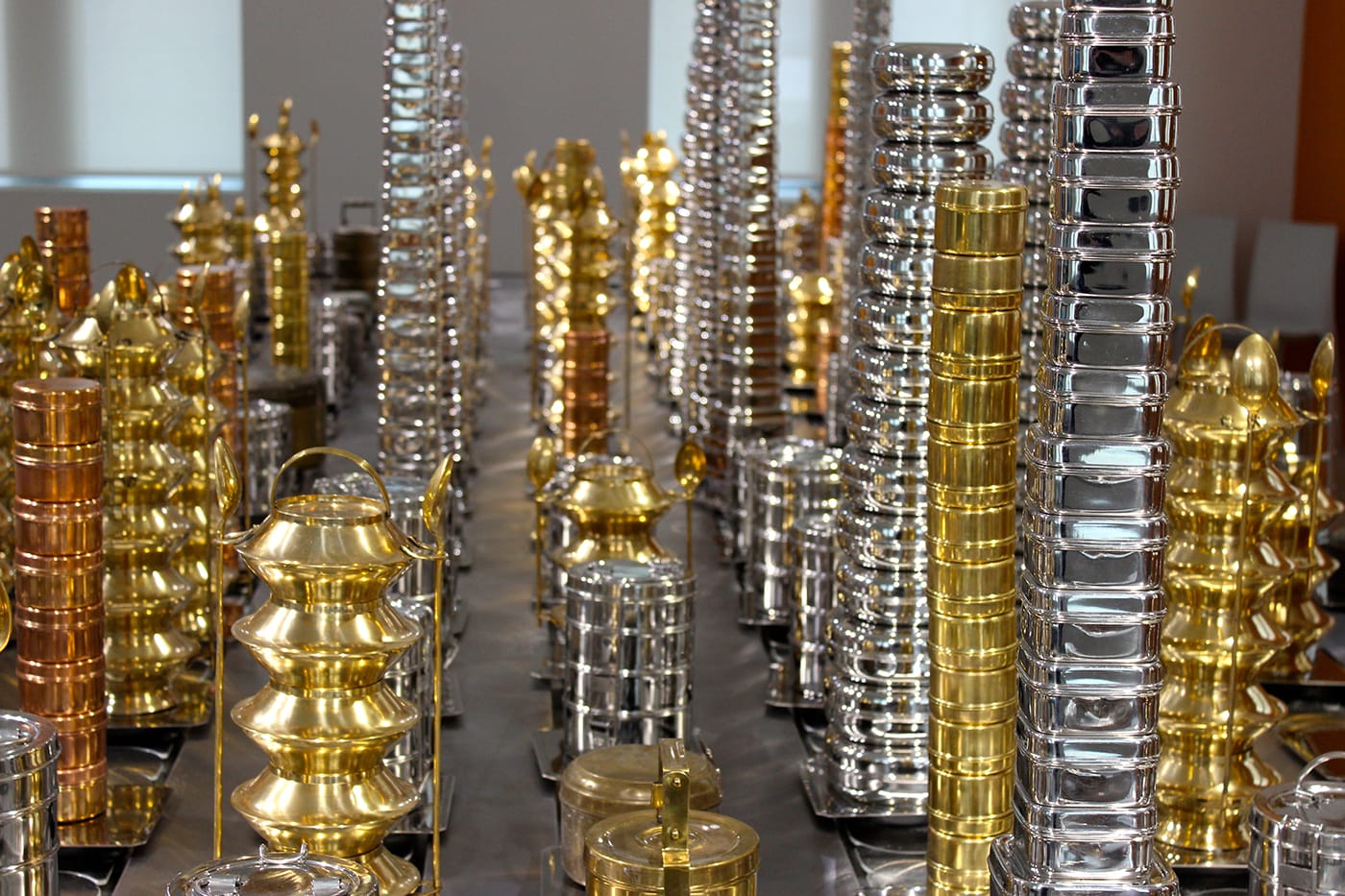 But the very nature of singular vision creates the opportunity for a blind spot. In the case of Visions from India, it took me some time to identify a thread of emotional dissonance arising in response to the tableaux, grouped in galleries on all three floors of the building. This dissonance was initially easy to dismiss, because I am a materialist, and Visions from India is rife with glorious and incredibly textured materials. Visitors are initially and irresistibly drawn from the entry hall into the largest first-floor gallery, which is dominated by a dynamic landscape assembled entirely of metal tiffin boxes — the traditional lunchbox of India — moving along a sushi bar conveyor belt repurposed into a snaking pathway across the top of an industrial steel table. “Untitled (Sushi conveyor belt)” (2008) by Subodh Gupta is the piece for which this gallery was expressly designed when the Pizzuti Collection built out the facility in 2011, and it has only now come to be displayed there. The effect of the piece is both hypnotic and quickly vertigo-inducing, with the moving tiffin towers managing to suggest a quiet, deeply aesthetic cityscape. It’s fun to watch, even as you start to feel your stomach turn. (Perhaps plan your visit before lunch.)