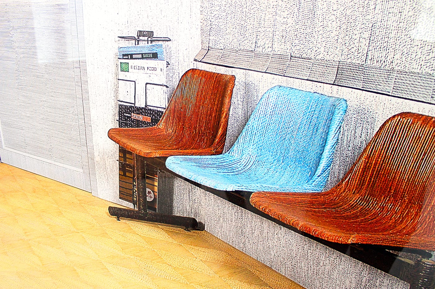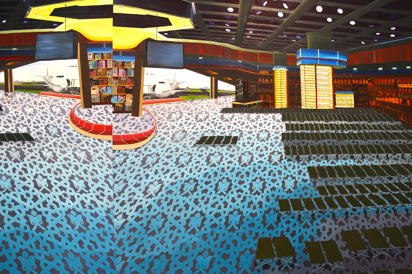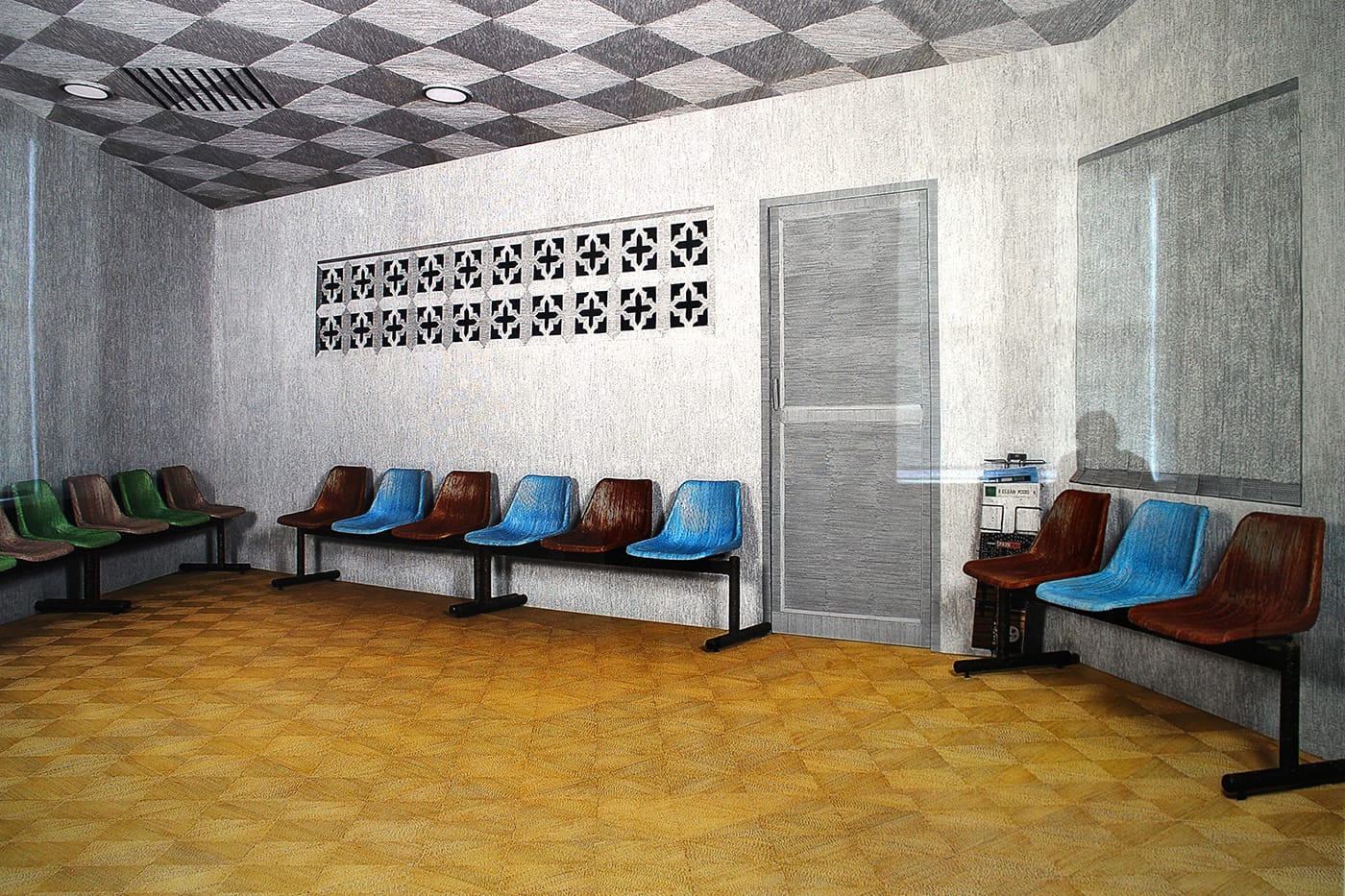 Collectively, the resistance displayed by either contemporary Indian artists en masse, or these particular collectors of contemporary Indian art, to consider actual Indian subjects creates a kind of vacuum in the space. In fact, a number of pieces seem to consciously elide their human subjects, as with Shetty’s “Untitled” (2008), which features a common clay water vessel rigged atop a mechanical conveyor performing an automated imitation of the human act of pouring — no human required. Two large-scale oil paintings by Kanishka Raja, which share the room with the massive sushi table installation, take as their subject panoramic airport interiors, with the two halves of the painting slightly offset around a median point. The mismatch within these paintings — the visual equivalent of a record scratch — is not their most jarring element, however. In one, “Double Duty” (2007), at least half the canvas is thick with rows of empty green cots. Like India, airports are never empty, never silent, so to see one entirely free of occupants suggests tragedy, apocalypse. A sculpture by Alwar Balasubramanian, “Self in Progress” (2002), the first work to greet visitors as they enter the museum, features a life-sized body casting of the artist sitting in a chair — his legs from the knees down emerge from one side of a dividing wall, his back and that of the chair from the other, and the rest of the figure is obscured, presenting the illusion of being embedded in the space between.