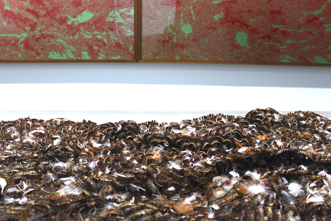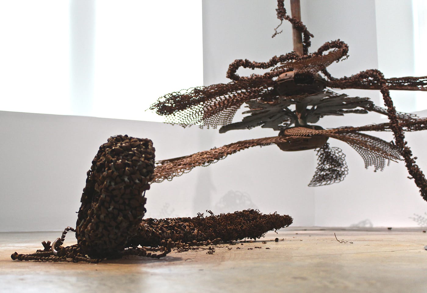 The celebration of material abundance continues in the adjacent gallery, where a colorful triptych wall of huge “landscapes” created by artist Bharti Kher through the application of arrow-shaped bindi marks on board form the backdrop for a floor piece by Gupta comprised largely of discarded and rusting molds for false eyelashes. These two works, each dealing with cosmetic culture, accretion, and abstraction through a process of sheer accumulation, form a fluid conversation with each other: as above, so below. Another side gallery off the main floor is entirely devoted to a second work by Gupta, this one an oversized and rusting approximation of an immobile industrial ceiling fan, with a spray of detached debris languishing on the floor around it. Pagano acknowledged the challenges of working with pieces made by the artist with entropy in mind, conscious of the warring desires to preserve the piece and to allow it to fulfill its destiny of decay.
