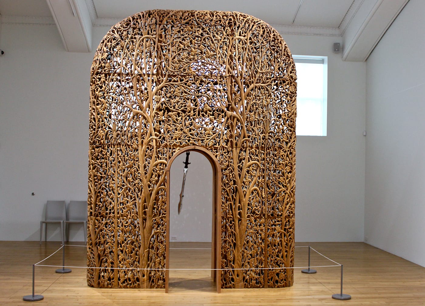 Moving upstairs, more wonders are revealed. The Pizzutis have collected a number of works by Sudarshan Shetty — perhaps one of the more widely recognized names in the show — and one of the more striking in the giant, kinetic “For All That We Lose” (2011). Standing nearly 12 feet tall, this freestanding and ornately carved wooden gateway incorporates, like much of Shetty’s work, sections of reclaimed teak salvaged from the wave of fast-moving development that often leaves one of India’s most common historic building materials in discard piles. A swinging sword sweeps through the arched portal, transforming the structure from a gateway to a pendulum clock, its face replaced by the decorative motifs that, like time, are slipping away as India rebuilds structures in the vision of its future.