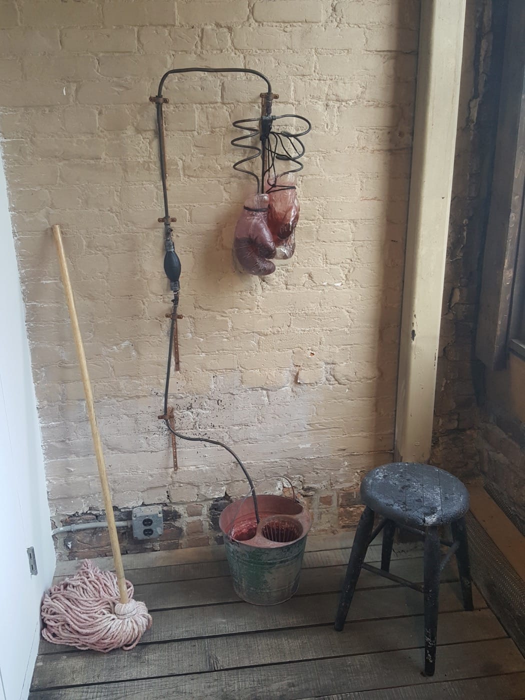 As much as I appreciate Betye Saar’s “The Game of Chance” (2016), a small whitewashed birdcage containing a clock and a fake bird, it doesn’t seem to belong to the exhibition. But the work of her daughter Alison Saar is, for me, one of the best in the show. “Black Lightening” (2012) consists of a pink-tinged mop, a four-legged stool, and a bucket of water that’s slowly emptying reddish water upward into a pair of glass gloves. The piece strongly evokes the boxing ring and the blood that’s always being spilled there. The competition is an exchange of fluids — blood for water, water for sweat — with the cycle continuing until the gloves are too heavy to carry on fighting.
