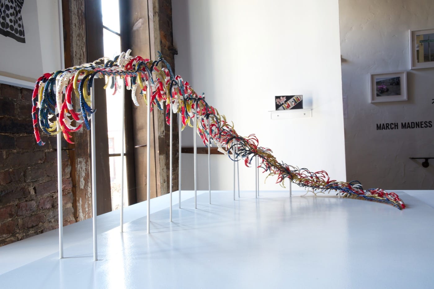 Although the theme is a bit overdetermined, the exhibition is worth visiting because the work cleverly presents us with the appurtenances of sports: the equipment, trophies, and objects that adorn athletic bodies. March Madness makes competitive endeavors about more than just winning and losing — that ever-present gutter into which most sports announcers and analysts make all the sweat, tears, spit, and blood spent on the court or field disappear. This exhibition makes apparent the absurdity of the personas we take on once we suit up — not so much to play with others as to prove to ourselves that we can do it at all.