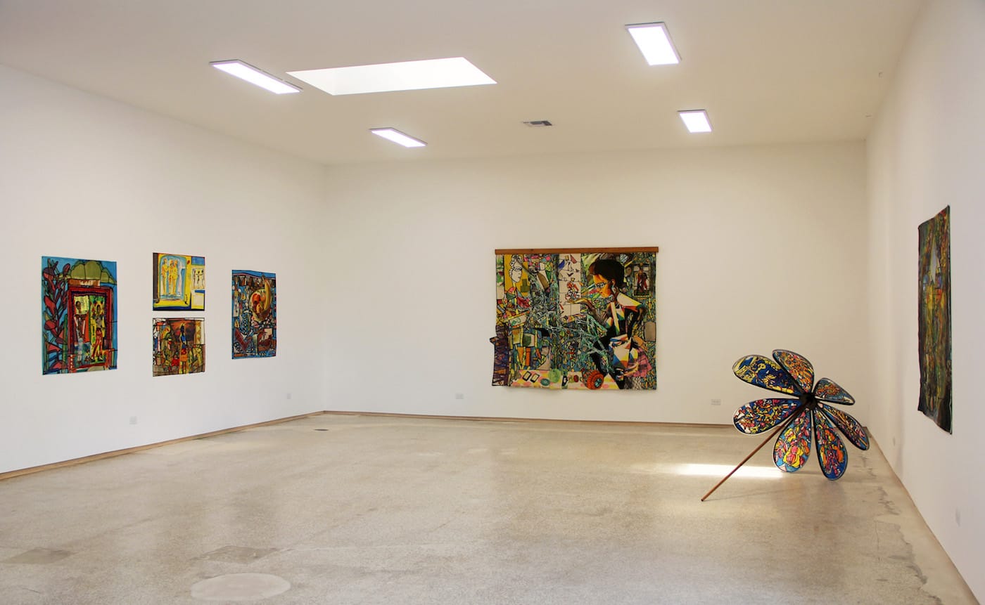 Women are everywhere in Wilson’s paintings. In her own take on the “Three Graces” — she frequently upends and pays homage to ancient Greek art — the Graces are red, yellow, brown, and support each other protectively. In “Inside Out,” the main figure, a woman, is silhouetted, gazing at a triptych of images: yellow-framed images of a couple kissing, a rainbow of color, and a brown woman with a stained-glass umbrella (nearby, a wood-crafted parasol that looks more like a giant flower rests on the floor, waiting to catch the light).