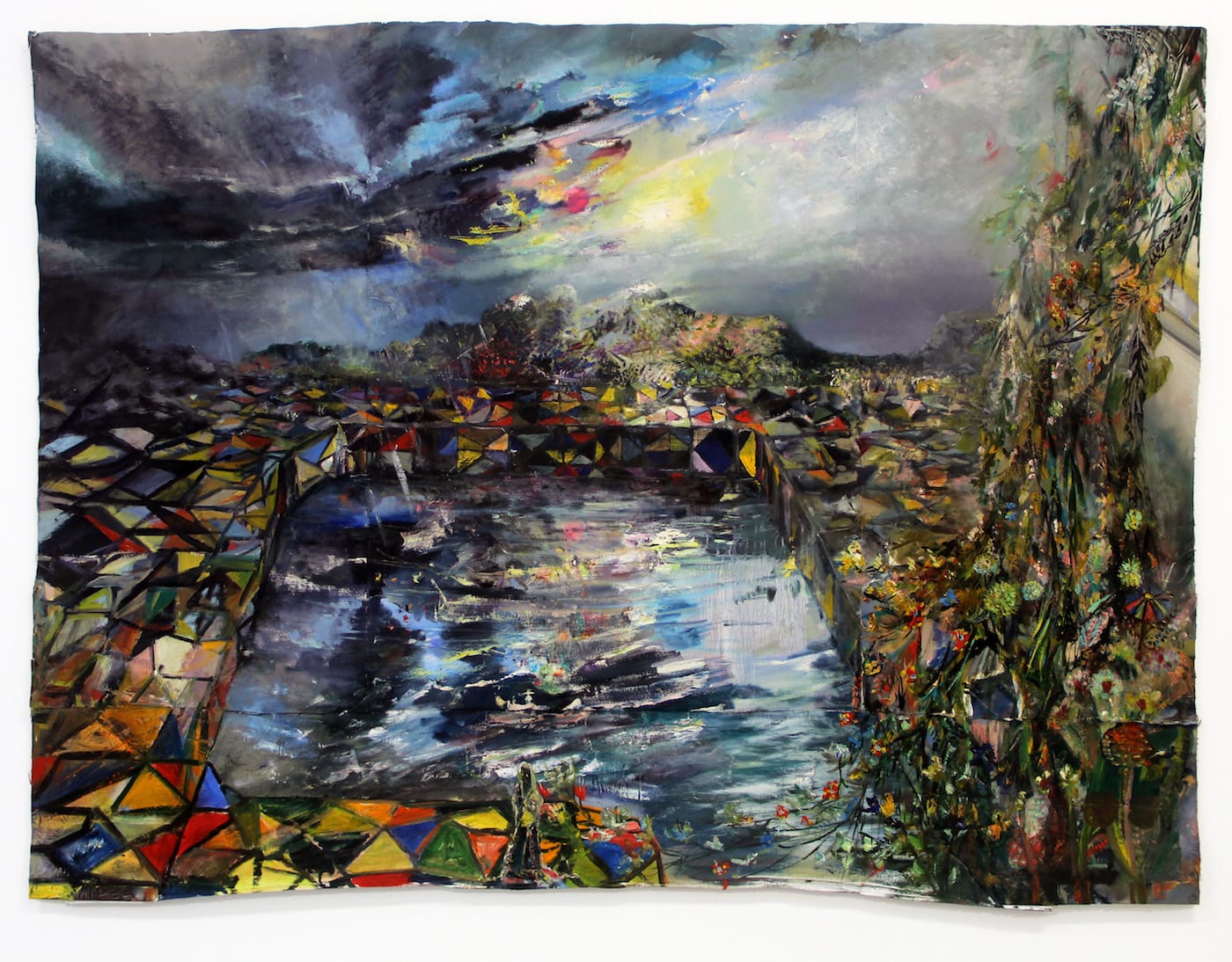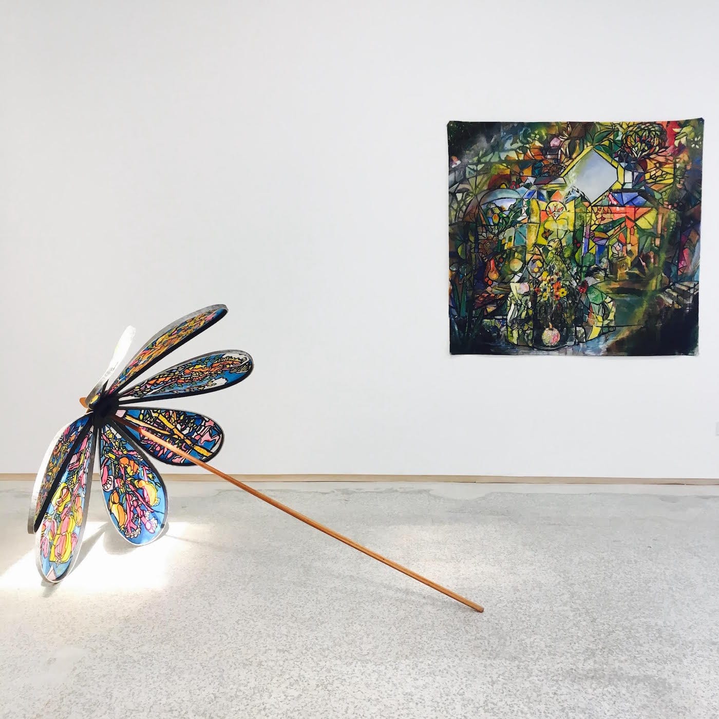 This kind of spiritual reverence permeates the entire exhibition, comprised primarily of paintings that recall stained glass and religious iconography. (It helps that Emerson Dorsch’s new space, which opened this past spring, has skylights that allow for streaming sunlight.) Not enough emphasis can be placed on Wilson’s love of stained glass. She is the granddaughter of a stained glass hobbyist, and it’s visible in her goddess’s skirt in “Salty + Fresh,” in nearly all of her paintings, and, in a quite literal sense, her tendency to craft together literal fragments, like they were shards of glass themselves. Her paintings, upon closer inspection, reveal fabric she’s dyed herself, machine-stitched linen panels sewn together, and collaged shreds from that seem to burst with joy. “What I love about stained glass as a motif,” Wilson explained, “is how it mirrors my own technique: cutting up and repurposing pieces that get fused together.”