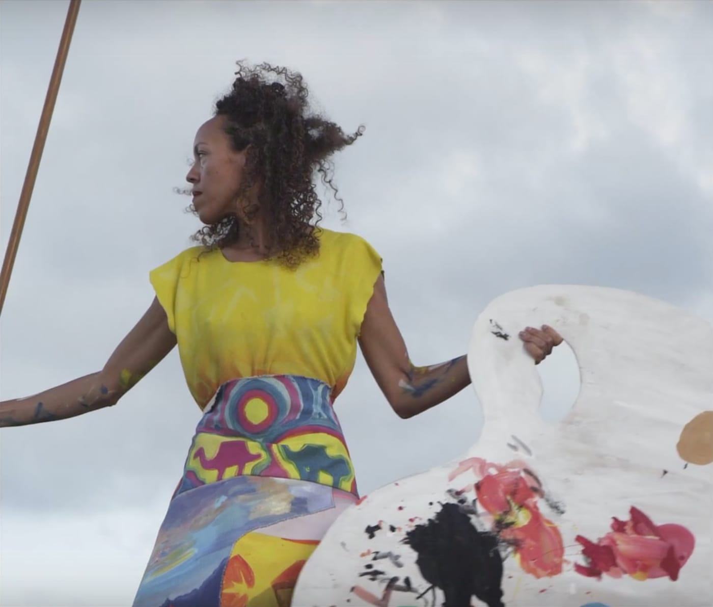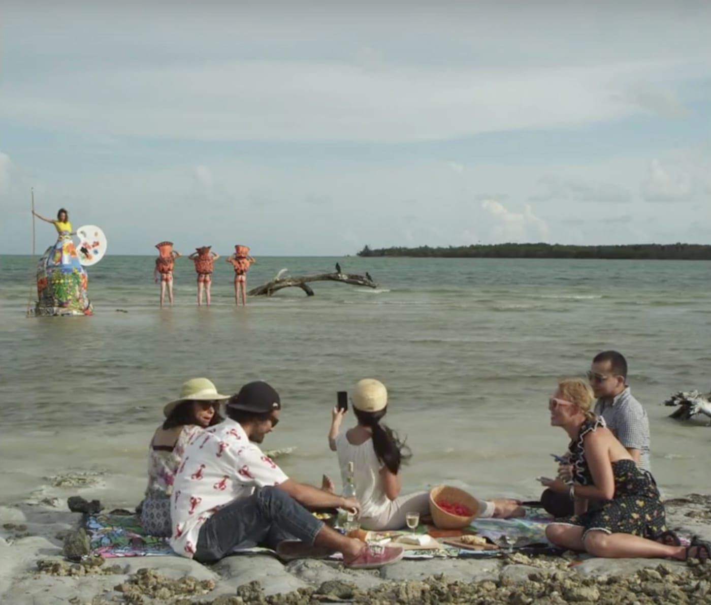 MIAMI — In Paula Wilson’s short video, “Salty + Fresh,” the artist becomes a giant goddess, tall and massive, rising from a mid-ocean sand bar on Virginia Key, her long, painted skirt lifting her like a turret. She wields a giant palette and an even bigger paintbrush, with which she paints three bodies, each carrying clay pots on their heads (to be clear, Wilson paints their butts, and only their butts). Tipsy picnickers on the sand watch her, less nonplussed than vaguely amused, and they snap photos with their phones, in the way that disinterested people often do — not totally disconnected, not wholly present either. Wilson looks too small in the viewfinders of their cameras; still, she is defiant, and she is huge.