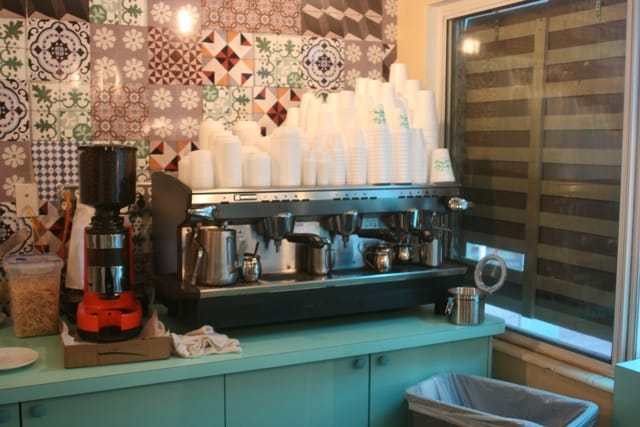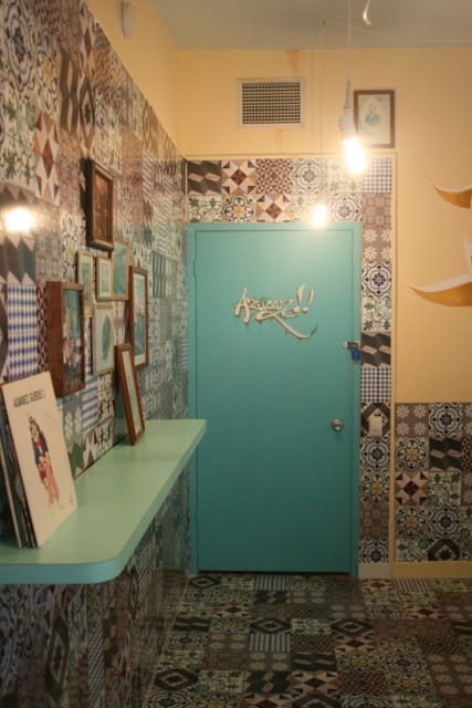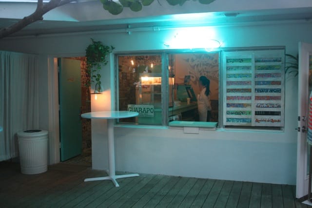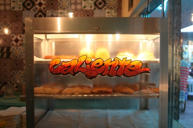 A neon “Cafecito Neptuno” sign adorns a shabby-chic pocket-size space that features a collection of textual murals from Parlá — the hot food case is labeled with a red and yellow “Caliente.” The walls and floor of the shop are adorned with what looks like colorful, patterned ceramic tile but turns out to be a photo mural, based on Parlá’s Cuba snapshots. Photographs of family are sprinkled throughout the space and even the styrofoam cups are hand-labeled with the cafecito’s name.