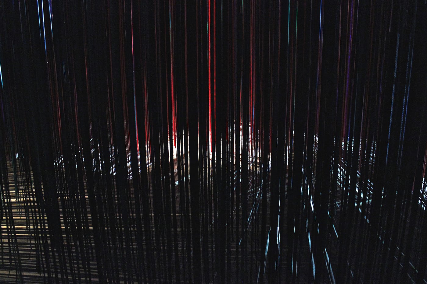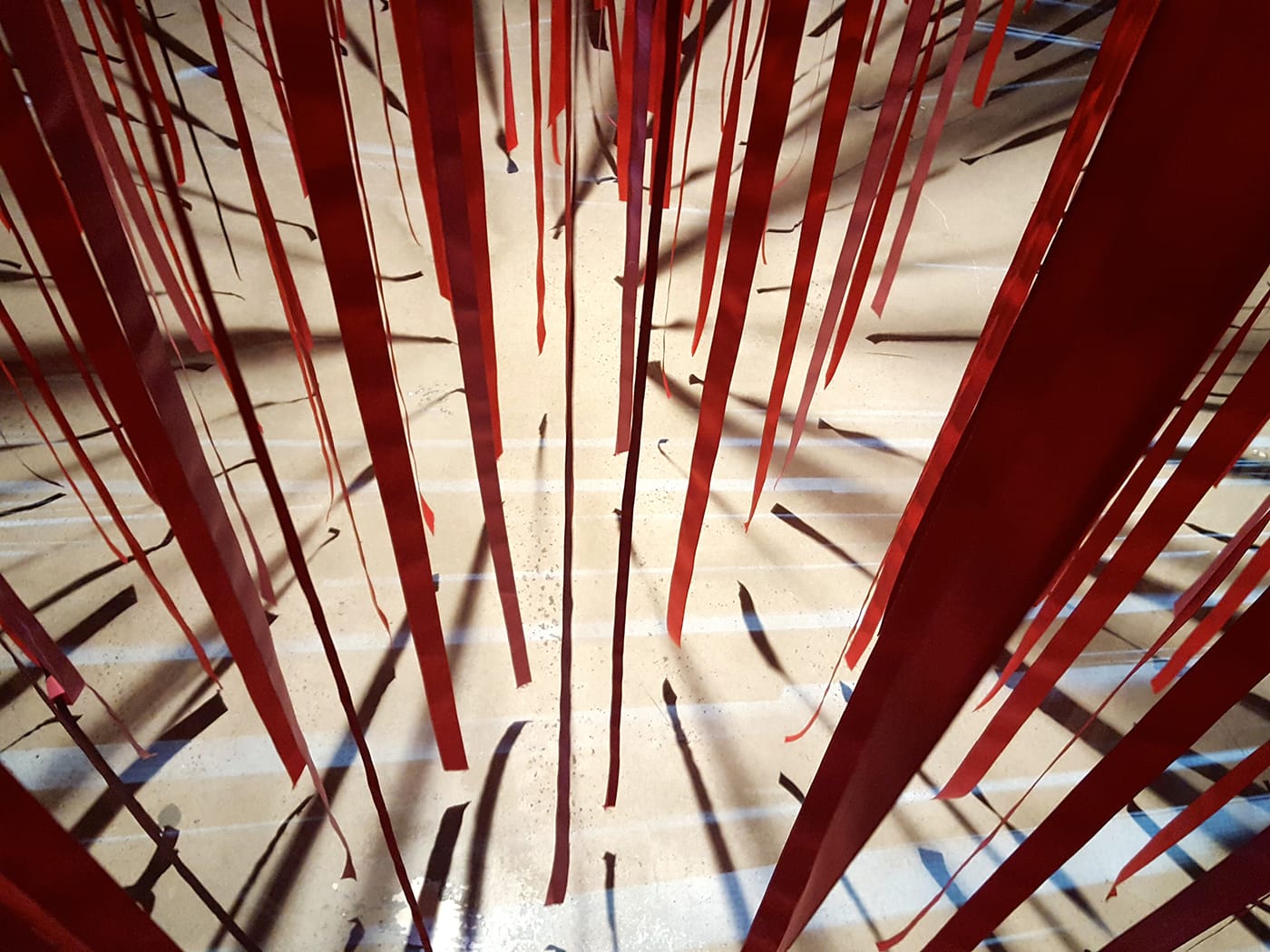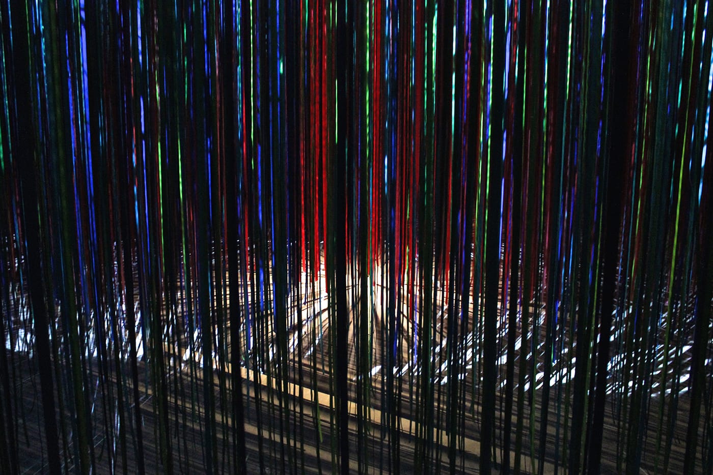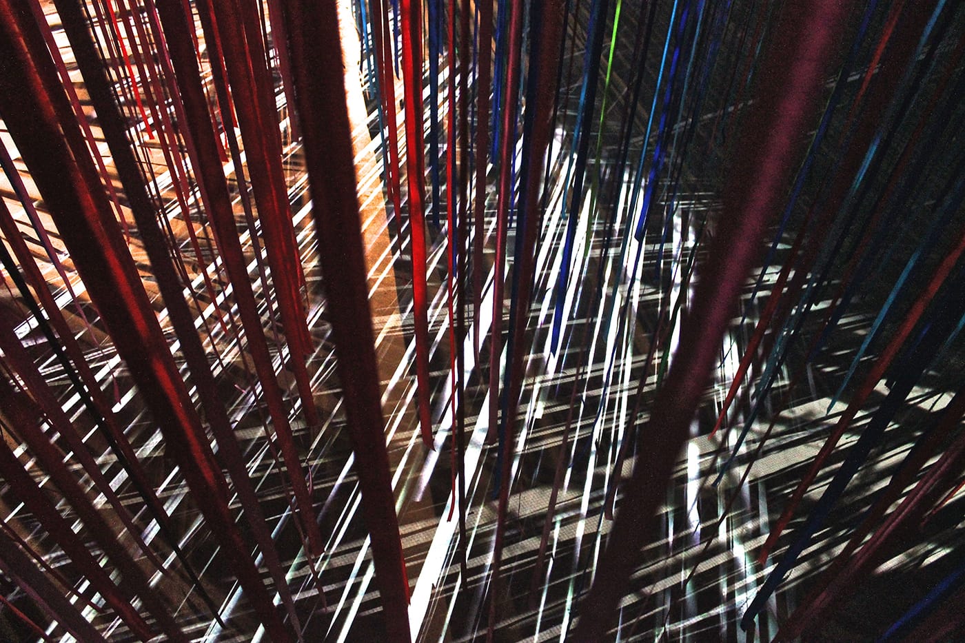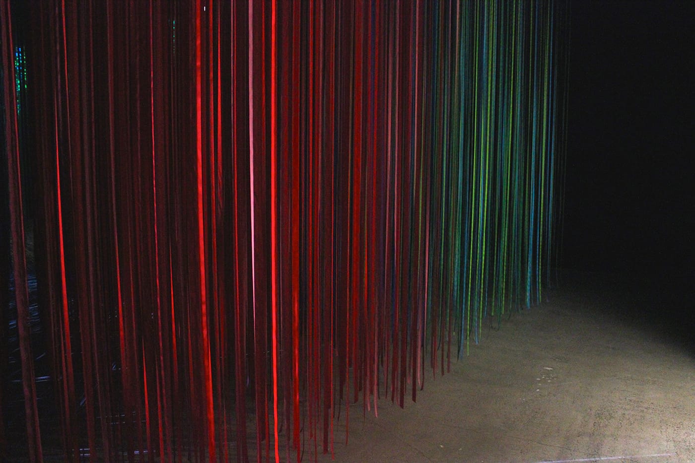 The resulting feast for the senses is completed with touch, as viewers are invited to enter the space and wander through the field of ribbons by any path they see fit. The room is darkened, with the brightest point being a kind of circular clearing in the midst of the piece, surrounded by red ribbons. The color-coding and density of the ribbons correlate to emotional states.