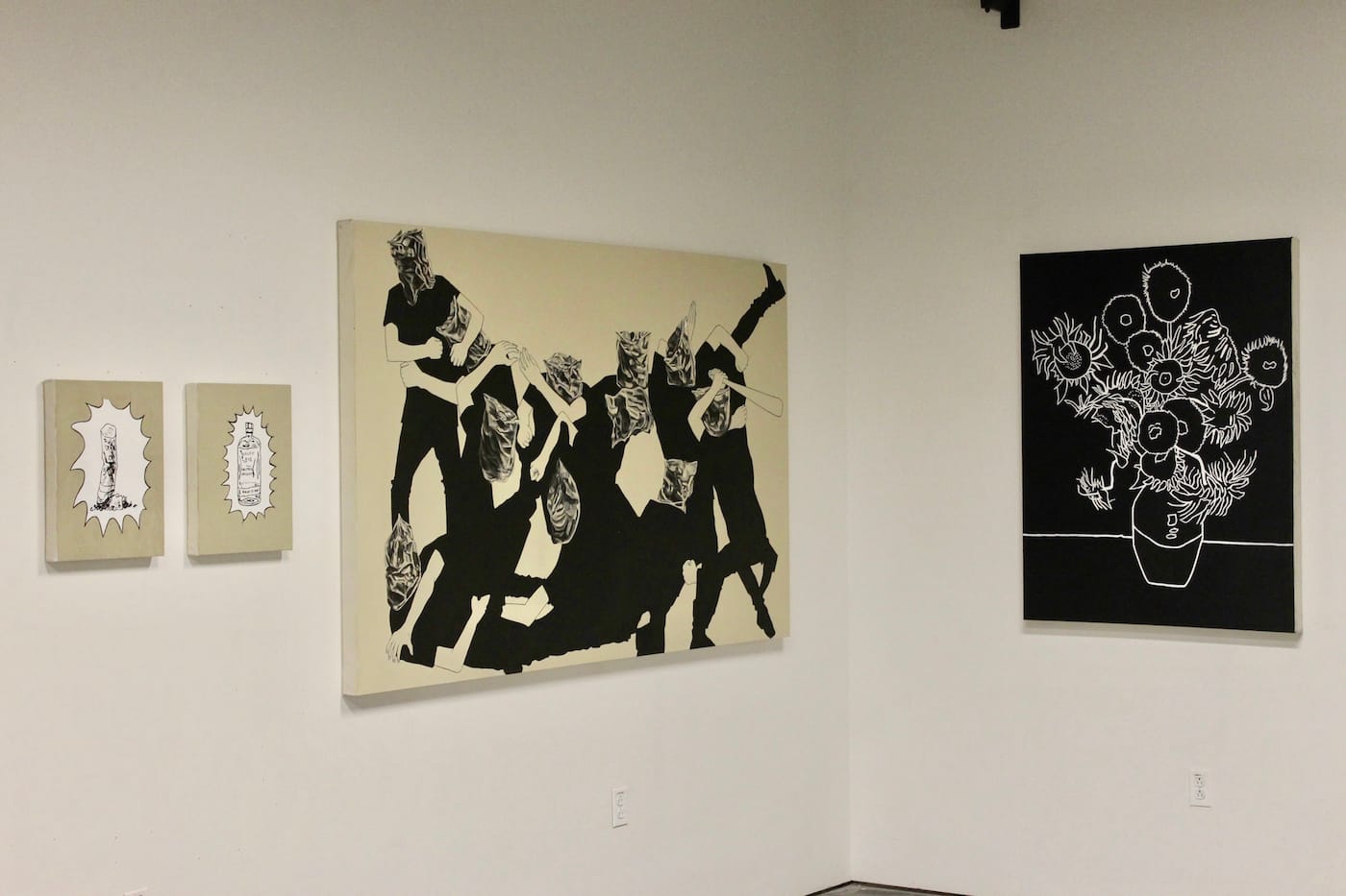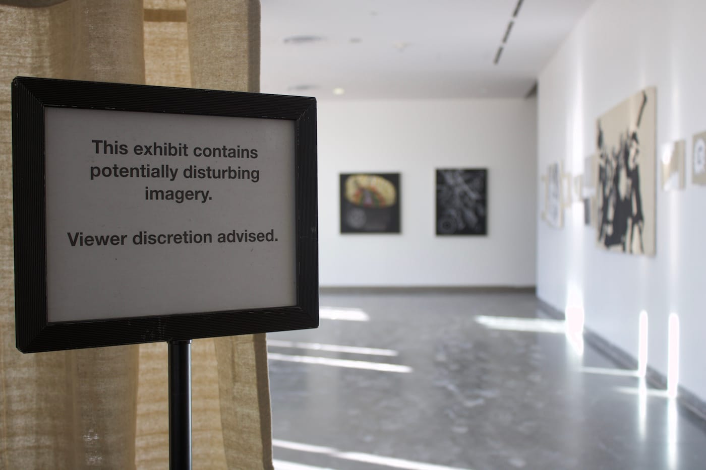 When Williams arrived at his exhibition Friday afternoon, shortly before the opening, a sign warning viewers about the potentially disturbing imagery and curtains were present. “They appeared overnight,” Williams noted. “I didn’t know they would be there, but I had no problem with it.” A department assistant then informed Williams the entire show had to be relocated to the basement after the opening because it was inappropriate in the current space. Shortly after, Williams received an email from the department chair Kirk Ambrose reiterating the message. Williams claims his requests to meet Dr. Ambrose or proposals to remove images of concern were rejected. “You can’t just say the whole show is inappropriate. My abstract paintings are inappropriate? It’s an art school, if you can’t test dicey ideas here, where do you do that?” University officials declined to comment on the specifics of the case.