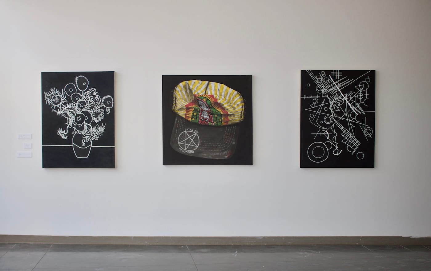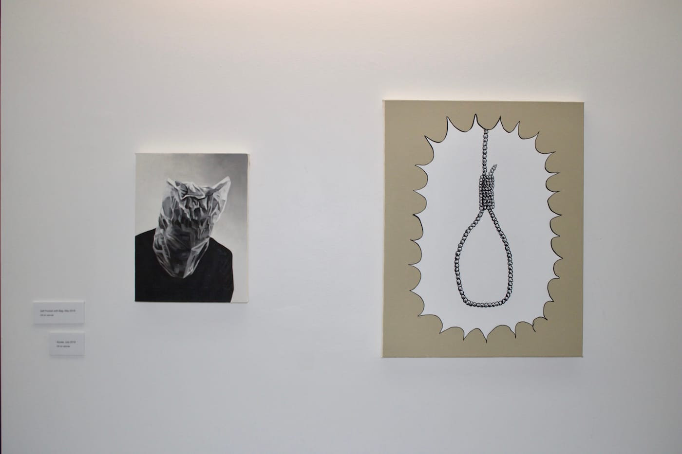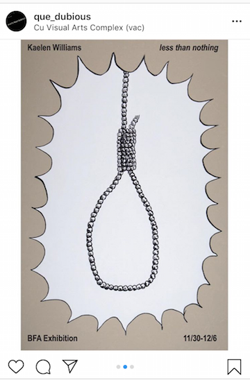 Last fall, University of Colorado student Kaelen Williams learned he was the only BFA student scheduled to graduate in December. Typically, the last semester of the BFA program requires a seminar comprised of students across art departments, lead by a faculty member, that culminates in an exhibition produced, curated, and promoted by the class. In the absence of a cohort, an independent study supervised by faculty advisor Alvin Gregorio was substituted. Williams told Hyperallergic in hindsight, “it would have been nice to have other people to talk to about what I failed to see.” What transpired was a solo exhibition presented in the lobby of the Visual Arts Complex, a building dedicated to the art and art history department. The high-traffic lobby doubles as a large hallway to first floor studios, classrooms and some faculty offices. Williams installed an exhibition titled less than nothing which he explained, “deals with the ego versus collective consciousness.” The exhibition of over 30 paintings included an image of a cigarette butt, a tangle of figures fighting with heads bagged and a painting of a noose. “I wanted people to acknowledge their assumptions about objects. Nothing has inherent meaning. I was thinking about a Death Grip song and I’m obsessed with the book Infinite Jest, by David Foster Wallace. He hung himself. The racial associations were so far from my mind.”