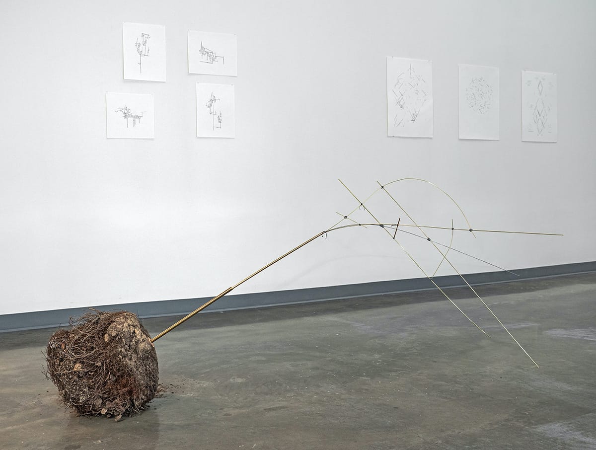 Jillian Conrad, "Rootball" (2022), rootball, brass, putty, bread dough, string. 4 x 8 x 2 feet