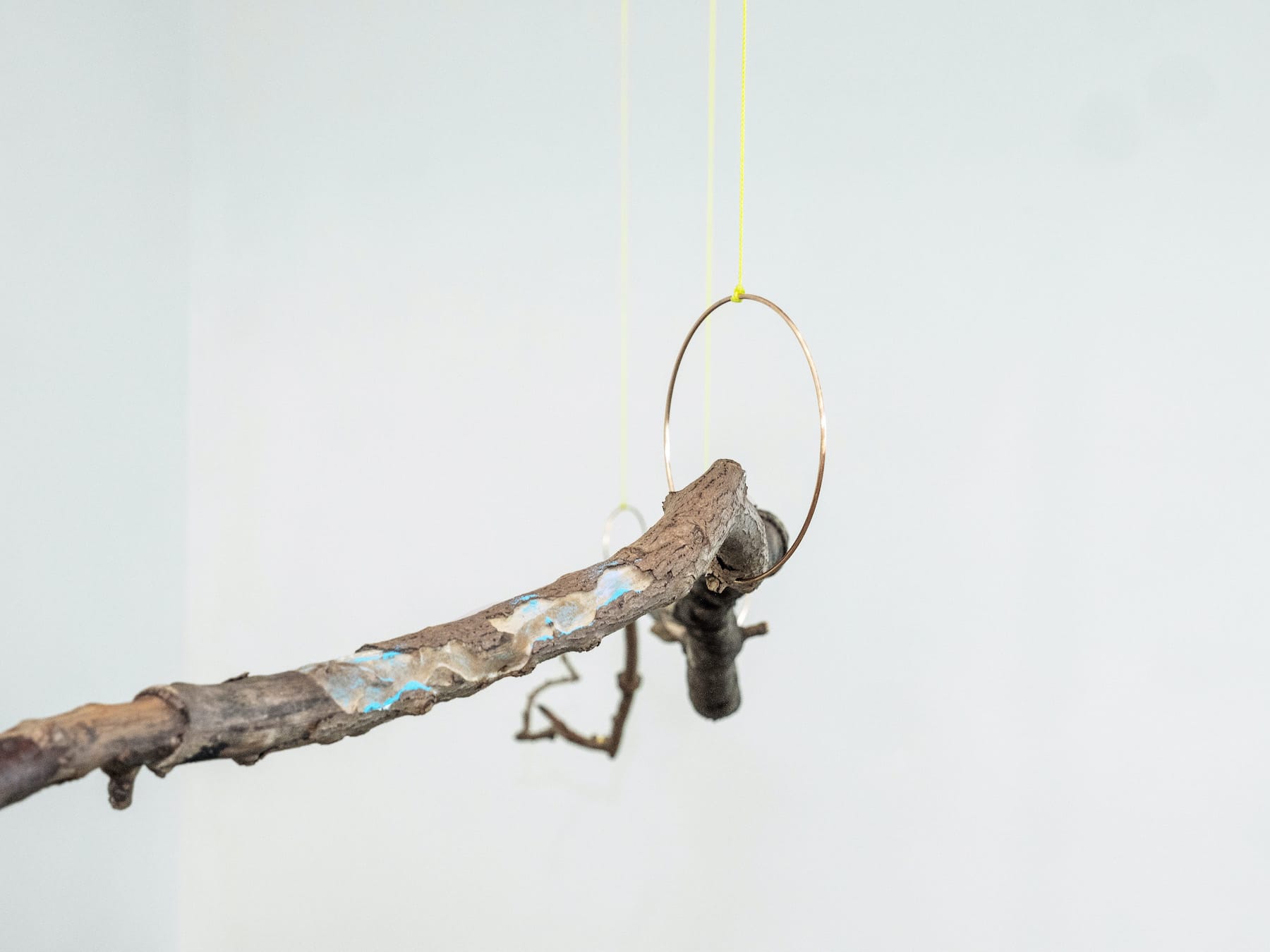 Conrad’s specific thing “a stick or a sleep” is ostensibly a 21-foot-long sculpture composed of branches of pomegranate wood, hackberry, crepe myrtle, and oak, joined to form a single linear form, which is suspended from the ceiling by brass rings attached to nylon. She has applied different pigments, including blue and yellow, in a few discrete areas.