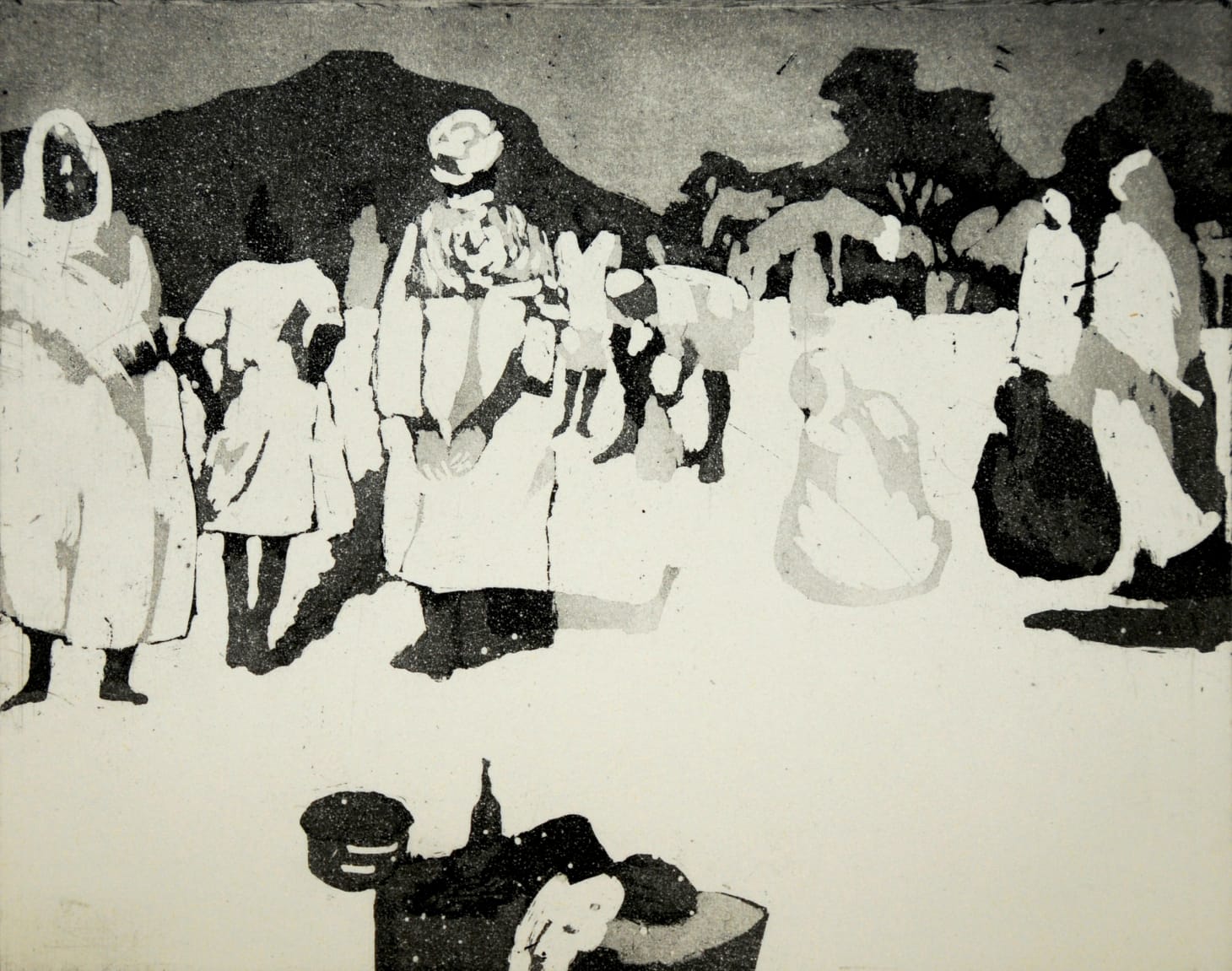 Mohammad Omar Khalil, “Marketplace” (1965), aquatint, 18 x 23 cm (image courtesy The Mosaic Rooms)