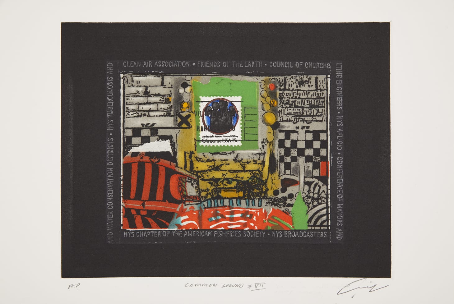 Khalil continued to work with a grayscale palette long after settling in New York (as seen in his 1999 Harlem print series), where he worked in carpentry and printmaking before finding a job at the National Center for Etching. Yet eventually his encounters with new people and ideas prompted works like “Common Ground VII” (1985-1995) that incorporate color, as well as collage elements and references to pop culture.