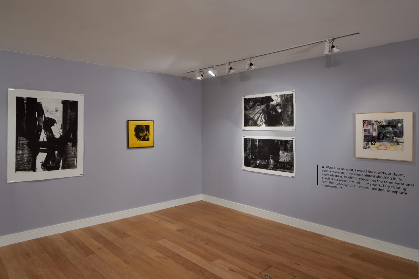 In addition to his art practice, Khalil has another great passion: music. At the Mosaic Rooms, the exhibition concludes with a gallery dedicated to musicians as diverse as Bob Dylan and Oum Kulthum (also spelled Umm Kulthum and Oum Kalthoum). Khalil used to listen to Bob Dylan in Sudan; he described the sound of his music as “mumbling.” This love of music is represented in a series of typically black works inspired by Dylan’s music, while the familiar face of Oum Kulthum makes an appearance in “Oum Kalthoum” (2008). The latter combines lithography, collage, and watercolor to form images of the Egyptian singer’s face, projecting the spirit of her legendary persona.