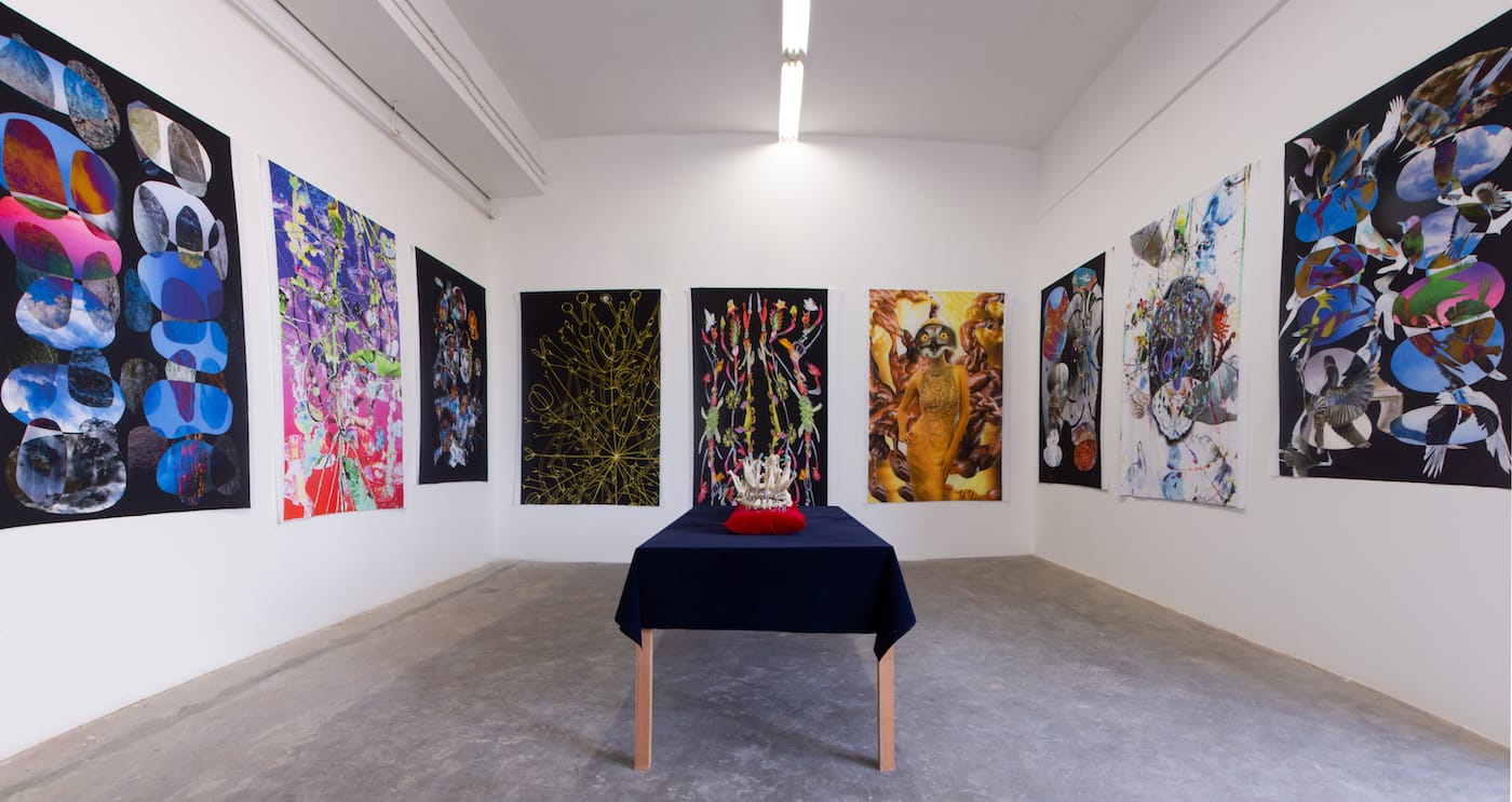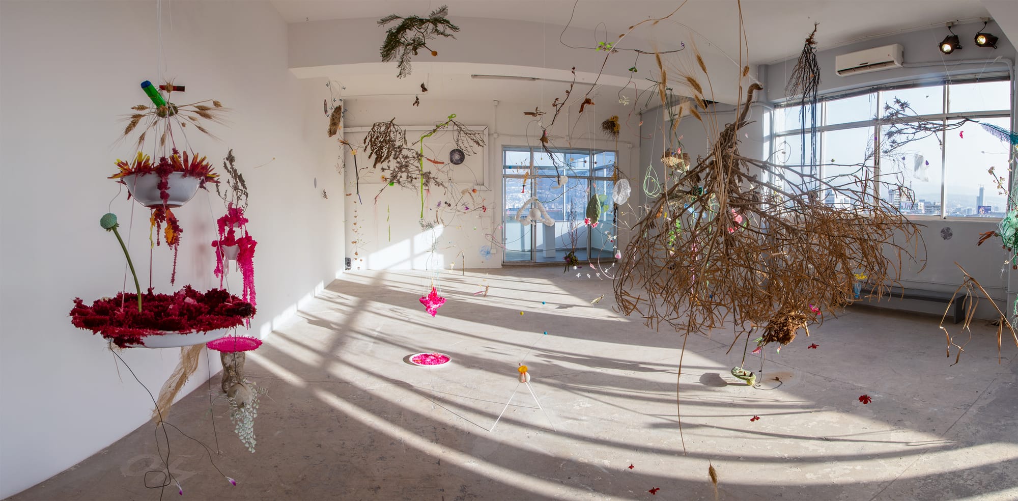 A pitted, faded cactus paddle is connected to a dried branch; cracked egg shells are suspended exquisitely beneath a bird of paradise flower, which appears to be real, its vibrant orange and electric blue jostling with the deep, disturbing magenta of chemical fertilizer, which grows in particulate crystals on plastic plates suspended beneath sprays of dried grasses.