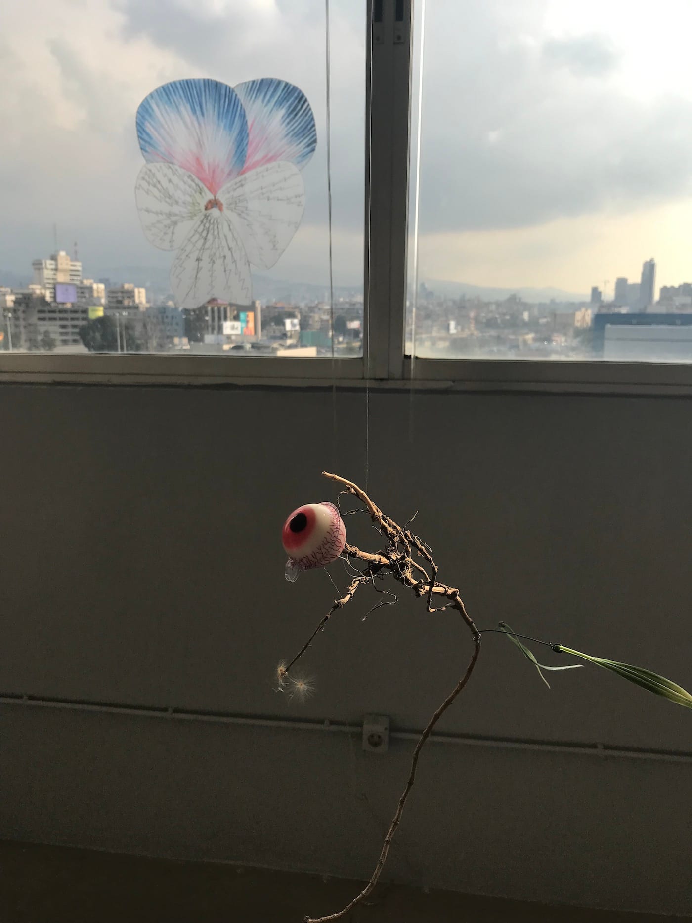 Thus, Gerda Steiner and Jörg Lenzlinger’s central installation in their exhibition les extrémités de notre univers at Sfeir-Semler Gallery, located in a nondescript building that I access via an unpaved parking lot, is not unfamiliar, despite its whimsy. Nodes of trash and organic matter rotate lazily in the nonexistent breeze, against the gray backdrop of the city. While in Lebanon, Steiner and Lenzlinger collected detritus — both organic and otherwise — from the gallery’s surrounding area, as well as from the far-flung Bisri and Bekaa valleys, arranging this flotsam and jetsam into delicate, spidery mobiles. Hung together, they form a surreal landscape, their intricacy, precarious equilibrium, and interwovenness suggesting some kind of symbiosis.