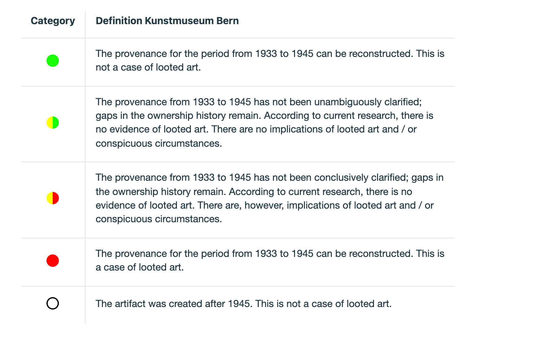 Upon Cornelius Gurlitt’s death in 2014, the trove was bequeathed to the Kunstmuseum Bern. The museum accepted the controversial bequest but entered into an agreement with the German and Bavarian governments stipulating that works deemed to be unequivocally Nazi-looted would be returned, while the museum could decide whether to concede ownership of works with uncertain wartime provenance. In 2017, the museum launched a dedicated team for provenance research. Researchers had been working according to a “Provenance Traffic Light System,” whereby works were categorized as “red” (definitively looted), “yellow” (unclear provenance), or “green” (definitively not looted). The Kunstmuseum Bern divided the “yellow” category further, into “yellow-green” (unclear provenance with no evidence of looting) and “yellow-red” (unclear provenance with implications of looting).