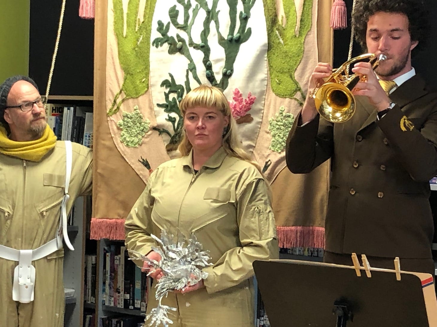 There was also more tangible, Kelp-inspired art on view. The Kunstnerhuset housed an entire strand of research around kelp curing. It offered the chance to try artist Tiina Arjukka Hirvonen’s slimy, claw-like kelp gloves and artist Anne Cecilie Caroline Brunborg Lie’s murky kelp headpiece complete with a coastal soundtrack. An array of kelp snacks and kelp kombucha further ensured that taste, smell, and touch also played a role. By now I felt quite immersed, partly due to the kelp spa performance, staged earlier by artist duo Devil’s Apron.