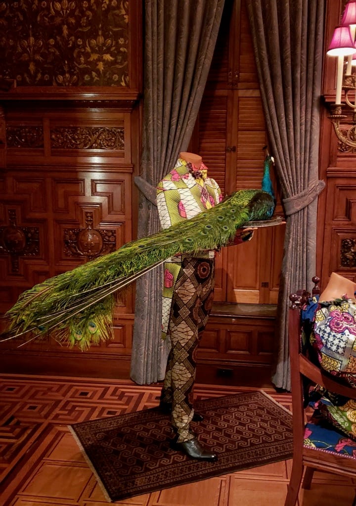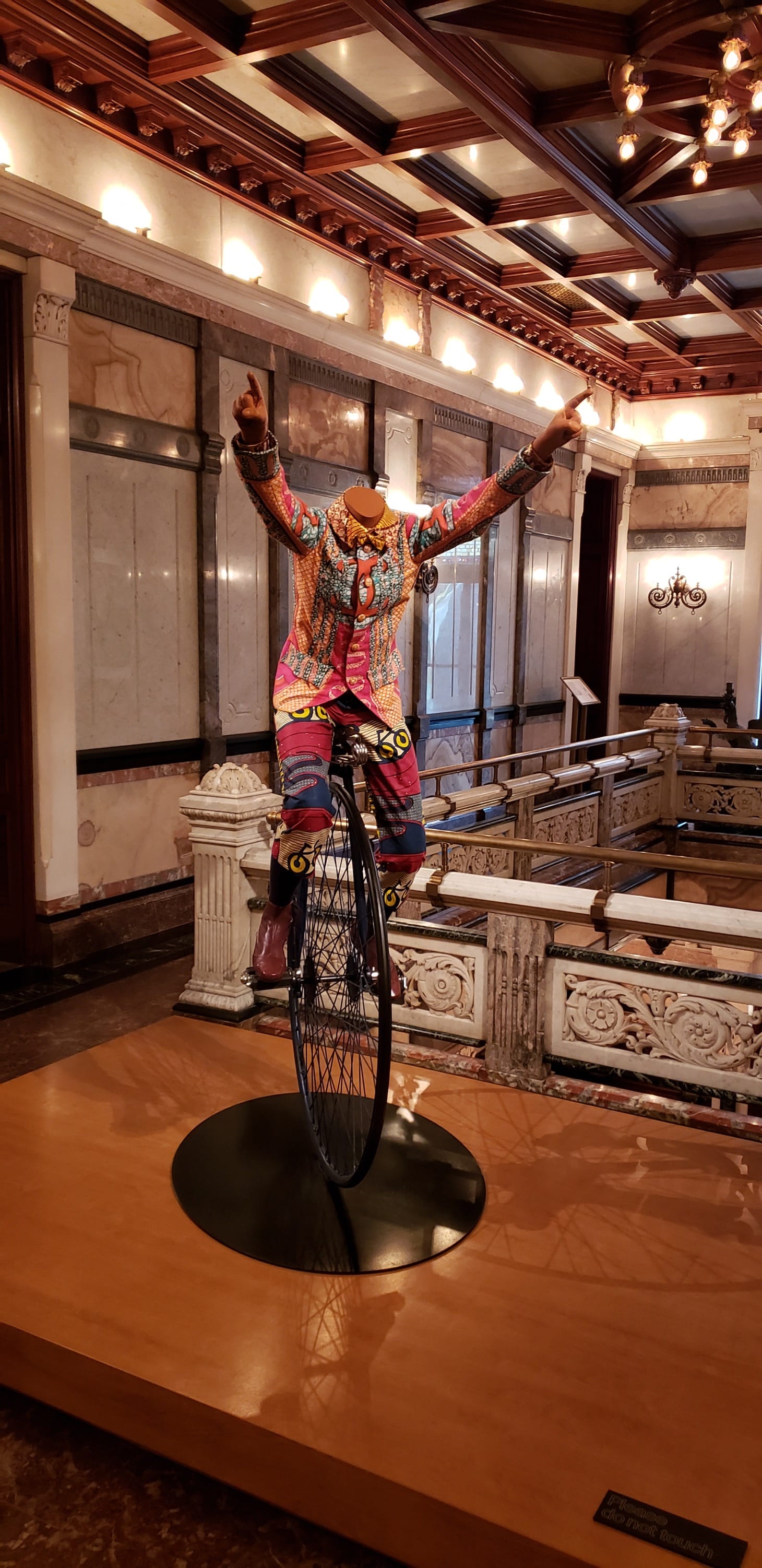 In some respects, it makes sense that Shonibare has installed his workin the Driehaus, a consecrated monument and tomb for the gilded age. A Tale of Today is also rightly titled, given that it is the inaugural exhibition in the museum’s new contemporary art series. When first invited to visit the Driehaus, I was told by the PR representative that the museum looks to engage new audiences by attempting “to look directly at how the Gilded Age mirrors the socio-economic issues of our own time, and bring those issues to the fore through exhibitions and programs.” Shonibare does dramatize these issues in depicting a scene of wanton indulgence: a waiting servant holds a peacock on a platter while the guests at the feasting table are in full revelry: oysters on the half shell on dinner plates, the guests tossing glasses brimming over with wine, kicking legs onto the table. In another room, the pater familias stands by himself preening in all his finery, which in part consists of a tail coat that ends in a double-faced train that drapes along the floor, his hands held out in a gesture that reads to me as “welcome to my kingdom.” In the hallway, a figure atop a unicycle gestures excitedly.