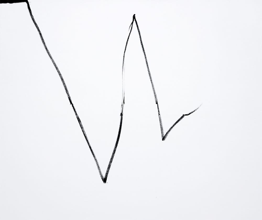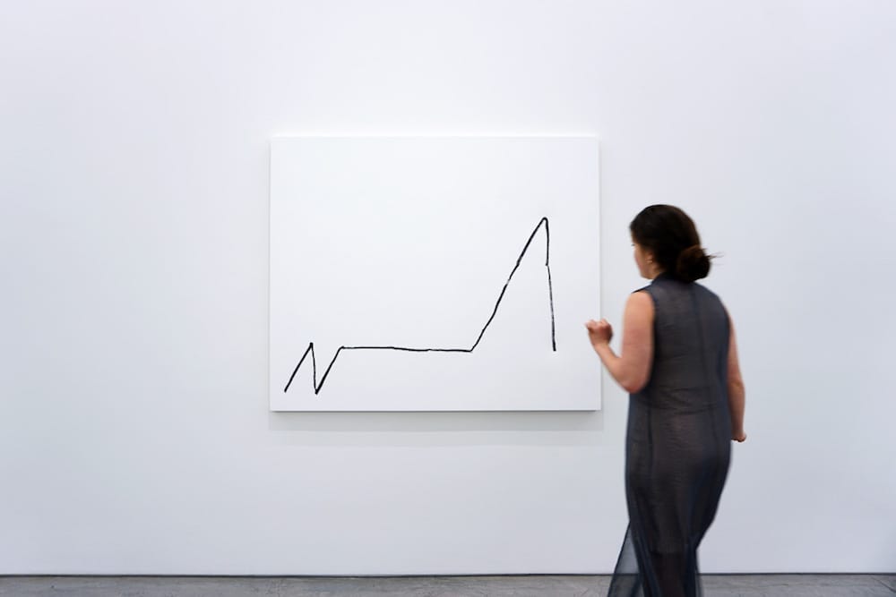 In January, 303 Gallery hosted an exceedingly clever performance installation by the early career artist Sarah Meyohas. Decamped at a glass table and attired in business wear, Meyohas traded obscure, modestly-priced stocks from her laptop using her own money. Her ambition was not to make money on the trades but rather to manipulate the stocks’ values. Those manipulations then served as the basis for minimalist oil stick paintings, each of which consists of a thick, smudgy black line, against an otherwise white canvas, charting the fluctuations in a given stock’s price. The resultant paintings—which differ from ordinary stock price graphs by virtue of their smudginess and their lack of axes, letters, and numbers—are the stripped down record of Meyohas’s trades.