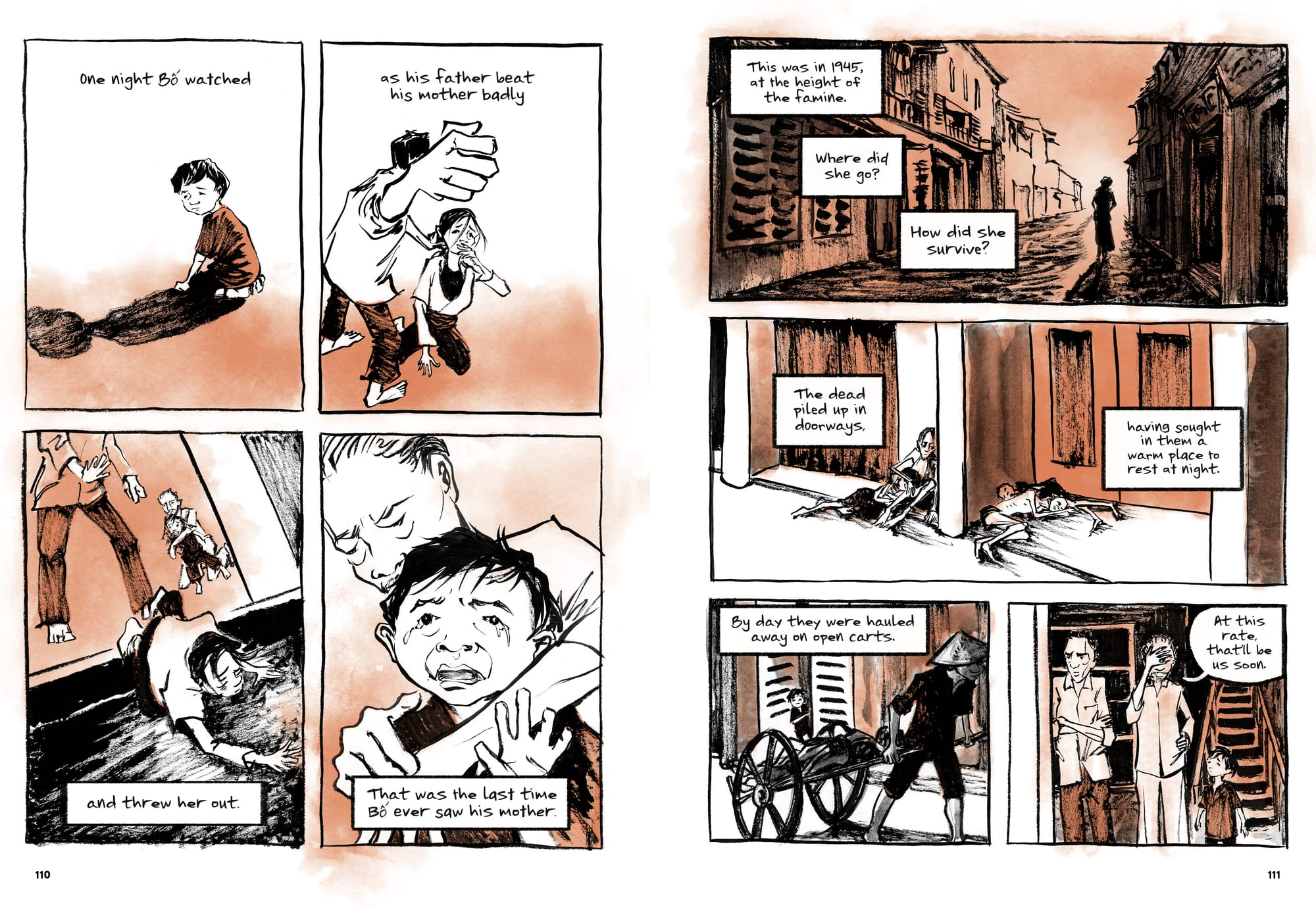 Bui recounts an arduous experience in Malaysian refugee camps and the overcrowded stay under her cousins’ roof in the Midwest that followed. During her family’s subsequent move to San Diego, there were Pledges of Allegiance, blatant racism, and “reasons to not want to be anything OTHER.” Similar to her comics essays on refugees and nationalism for PEN and The Nib, Bui pairs wrenching efforts to assimilate with historical context and difficult pre-immigration memories — her mother’s secret studies of Vietnamese culture under stifling French rule; her father hiding in an underground tunnel as a child while French soldiers burned his village. Decades later, we see American fighter pilots destroying “a country dependent on agriculture” and an illustration of AP photographer Eddie Adams’s infamous “Saigon Execution.” Bui’s research and geographic shifts amount to somewhat disorderly plotting that bounces us from the States to her native country and back, but it’s balanced by her versatility in portraying diverse settings, from tidy apartment interiors to Nha Trang’s beaches to ashy, angular village hut rooftops.