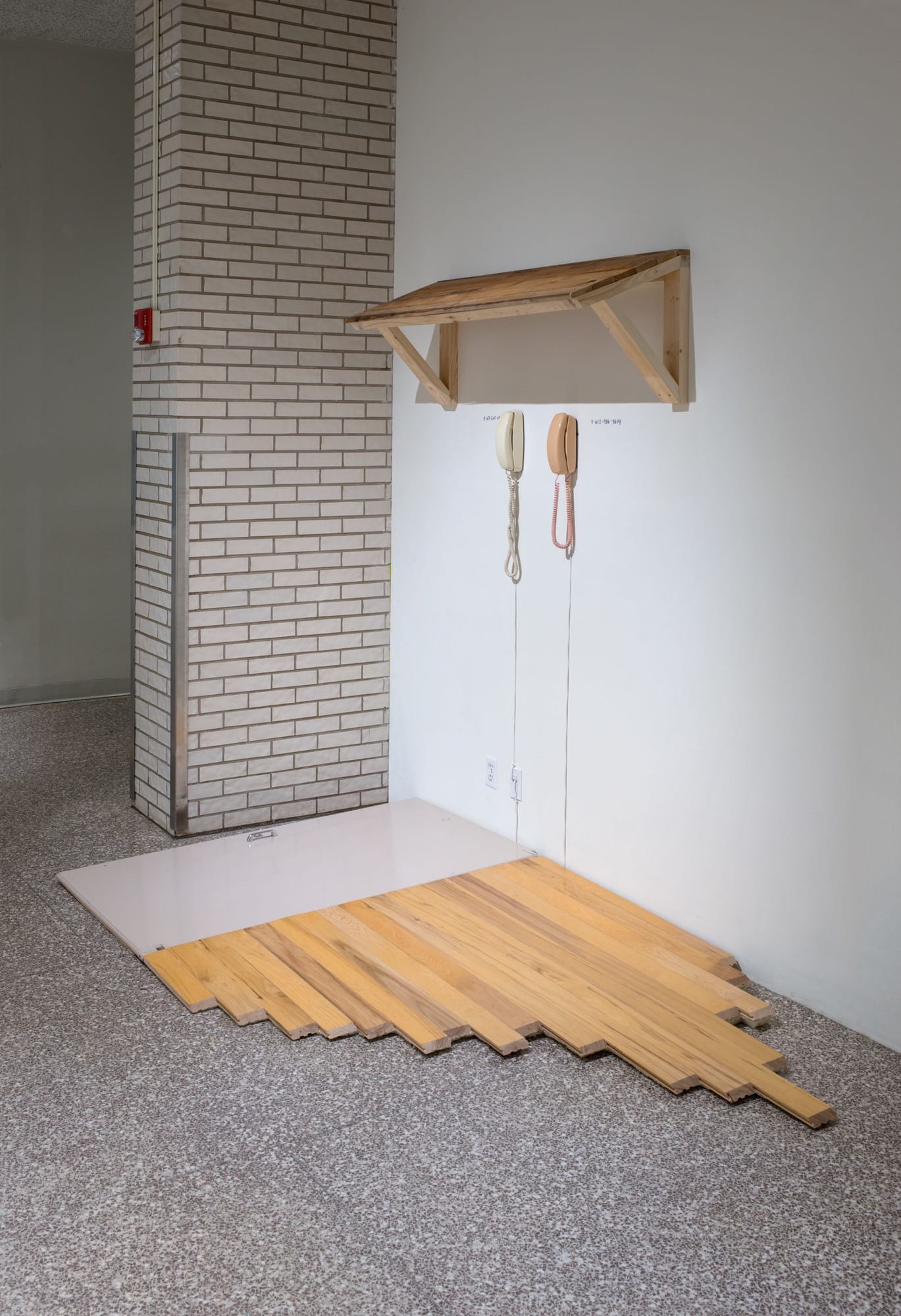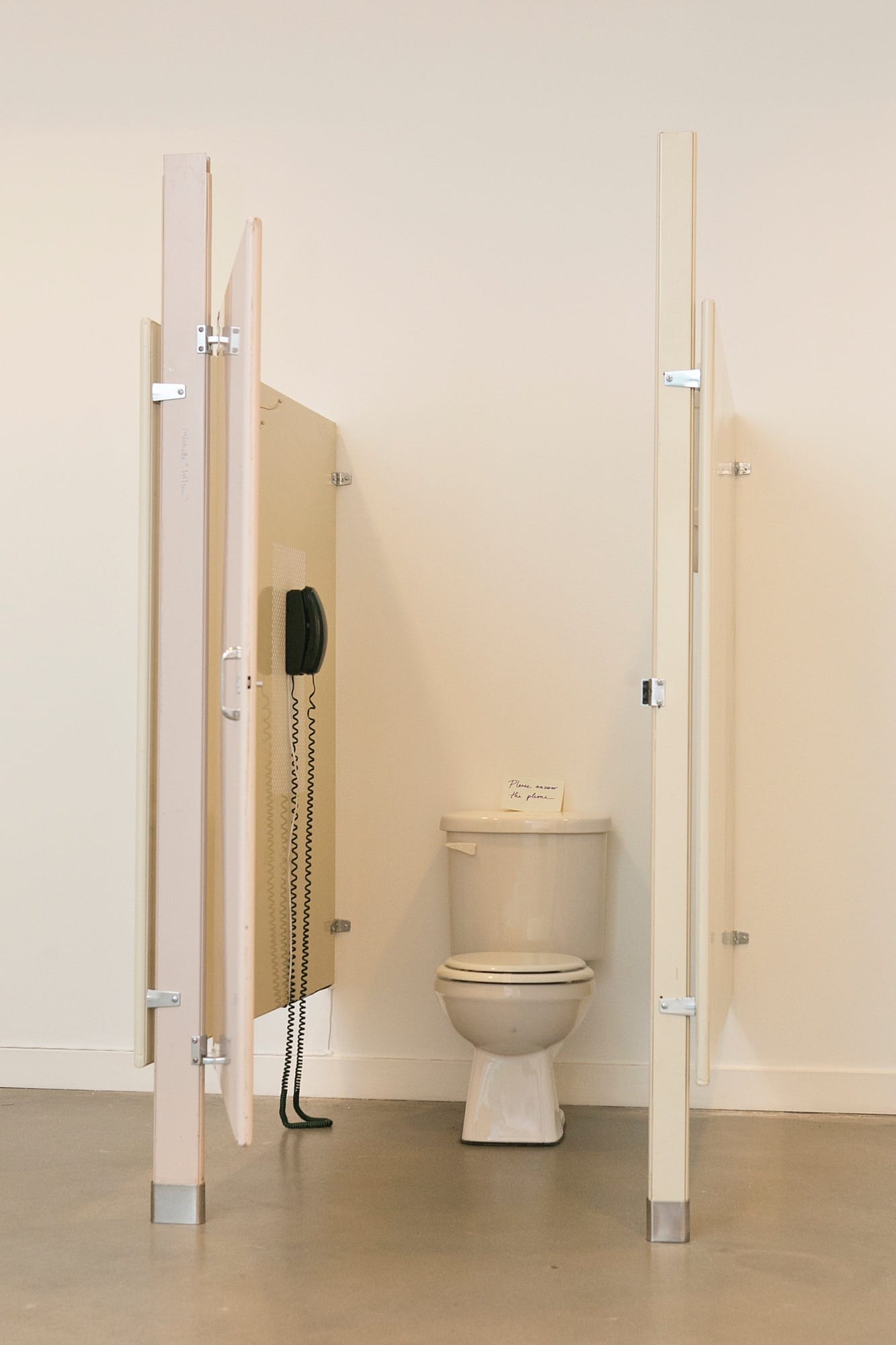 ER: Yes, they are portal spaces! I was interested in the ways that phones and bathrooms are similar; they are this way to get away from the present moment. “Hold on, I have to take this call” or “I’ll be right back, I just have to dot dot dot.” But bathrooms and telephones are also sites for potential connection. In “Stall,” there is a sign that says “If the phone rings, please answer.” I’d call the stall at random times and talk to visitors who choose to enter the bathroom stall to answer the phone. There is a kind of thrill when an art piece is calling you, but also a thrill about doing the illicit act of talking on the phone while you are peeing or taking a poop. This piece was a jumping off point for my next series of participatory works called “Calling Stations” which consist of bathroom stall partitions laid on the floor with a birch wheelchair access ramp, a chair and a phone number handwritten on the wall. The phone numbers in the two companion installations connect participants to each other or to my cell phone. I was answering strangers’ calls all the time, doing any number of mundane things, including going to the bathroom. Encounters now with cell phones feel very different because you can screen every call.