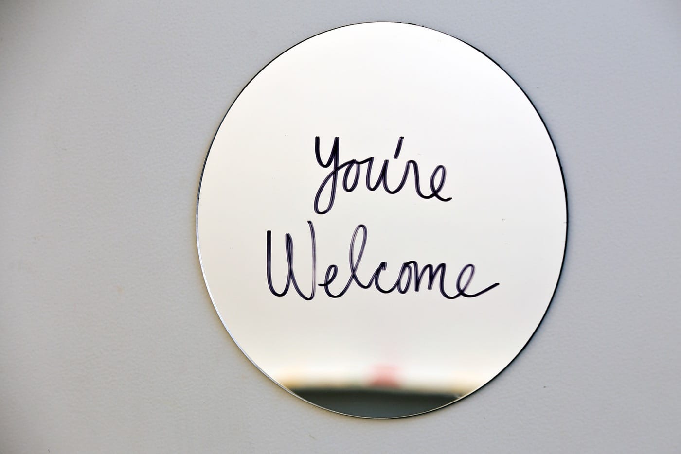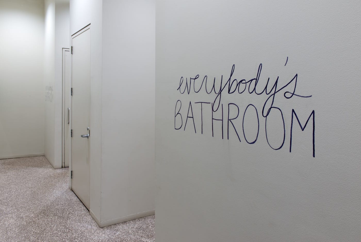 ER: I realized I was making work about the intimacy of daily life, including materials found in bathrooms like toothbrushes and soap, but I wasn’t addressing the intimacies of the spaces where I was exhibiting. The Rochester Art Center had sex-segregated bathrooms next to where my work was being exhibited. So I proposed to do a piece “You’re Welcome” (2016) which involved replacing the gendered signage with circular mirrors on which I wrote the words “You’re Welcome” in permanent marker. The text addresses the bathroom user. YOU are welcome, as in please come in, or colloquially you’re welcome to the person who says thank you for the unmarked bathroom. I was exerting some rare art privilege by making a piece that alters the institution’s design. Rochester Art Center permanently converted one of their bathrooms to all-gender after my show, as they didn’t have any before my exhibit. I decided to continue variations of this piece everywhere I exhibit now. I have made one at the Minneapolis College of Art and Design. I’ve also made super temporary signs that say “the bathroom” that have been torn down. Unlike the move to make single stall bathrooms “gender neutral,” I am making these multi-stall bathrooms “gender together.”
