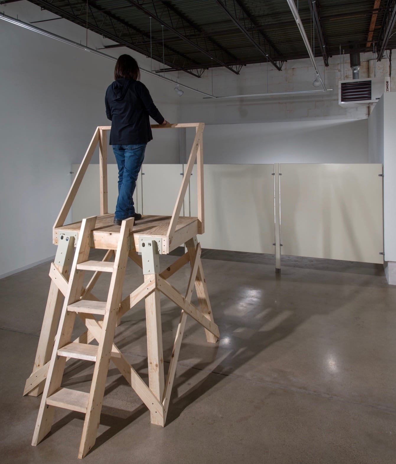 Emmett Ramstad: I built that sculpture in February 2017, right after the U.S. election when a lot of people I knew were talking about how vulnerable they felt, penned in and watched. I built my own wall from bathroom stall components to draw attention to how anti-transgender bathroom legislation distracts us from talking about the ongoing enforcement of exclusionary policies that create walls. Bathroom bills encourage people to police gender by monitoring public restrooms in the same ways that “respectable citizens” are called on to monitor their own neighborhoods for criminals or terrorists (read: people of color, Muslims, or people who look “different”). People are rewarded for exhibiting fear and making themselves monitors. But this is not specific to trans people; it’s a pattern of state securitization. When I built “Watching You Watching Me (Hunting Season),” I wanted to create tension between the position [of] the tower, and the area beyond the wall, the stall. Viewers can climb up into the platform and look over the wall to see what’s there. But they are vulnerable when they are standing alone on the platform. There is vulnerability in both watching and being watched.