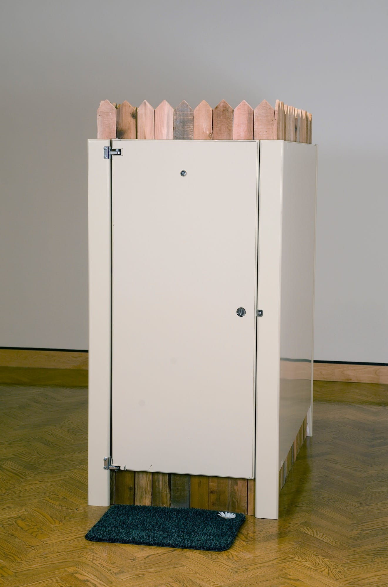 RP: In another work, “Safe,” (2016) the open space above and below a freestanding bathroom stall has been filled in by a picket fence. The juxtaposition of the fencing with the bathroom made me think of gated communities and gender neutral, single stall bathrooms. Both models seem to be material manifestations of a neo-liberal agenda and the increasing privatization and isolation of body. Museums in particular like to signal that single stall bathrooms are gender neutral, but is a bathroom really gender neutral if one person at a time can use it?