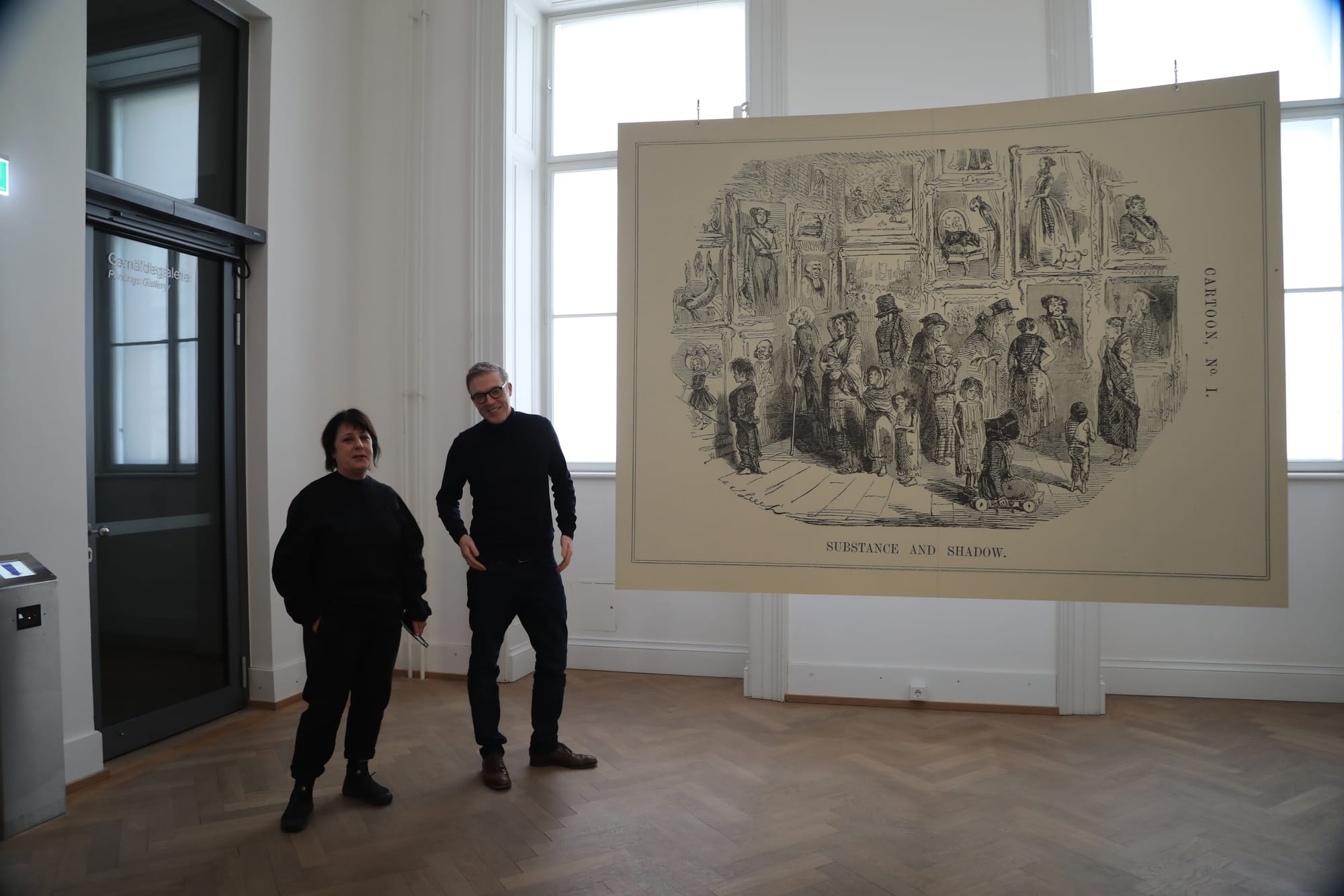 Folie achieves that critical vivisection of history through a dialectical method. The exhibition begins with a 19th-century cartoon. Such satirical works were, in Folie’s words, “a reaction to social upheaval, technological tension, industrial revolution." John Leech’s “Substance and Shadow” (1843), here displayed in oversized dimensions, depicts barefoot street children and paupers in rags during a period of hardship known as the “Hungry Forties.” In the cartoon, they inspect their “shadows,” aristocrats displayed in portraits at Westminster Hall, satirizing the insensitivity of the British establishment at the time.